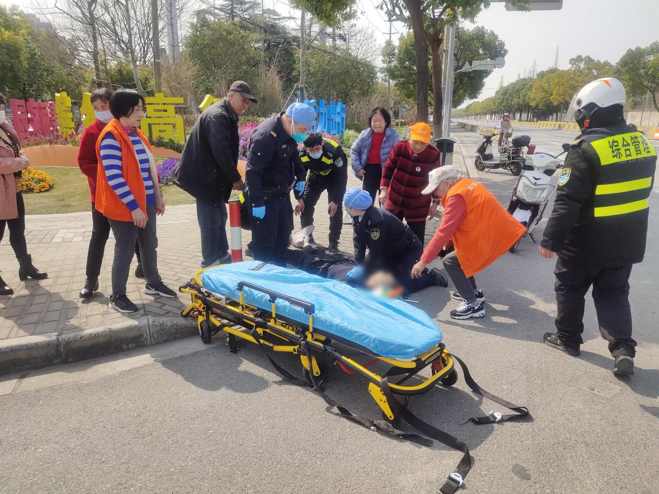 當(dāng)天10:50,公司員工孫豐寶、單峰和邵晨駕駛巡邏車巡邏至東葛路浦東北路交叉口附近時(shí),遇到幾位阿姨求助,稱前方有一位老人暈倒在地。三人聞?dòng)嵹s緊驅(qū)車來到老人身旁,靠邊停車察看。