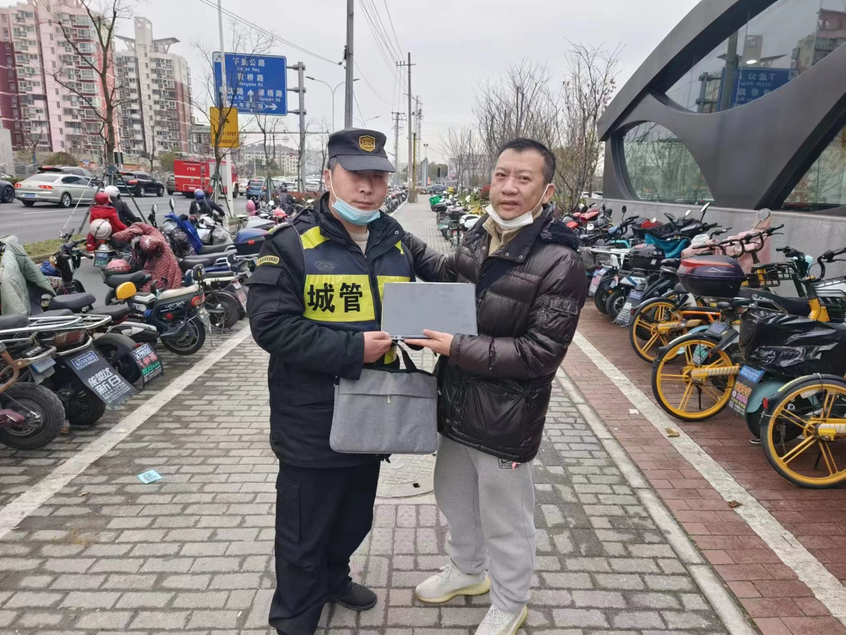 當(dāng)日12:16,公司員工董文韜在杭師大地鐵A口巡查時(shí),在一輛共享單車的儲(chǔ)物筐里發(fā)現(xiàn)一臺(tái)平板電腦沒人認(rèn)領(lǐng),就將情況報(bào)告了組長,并按指示守在原地等待。