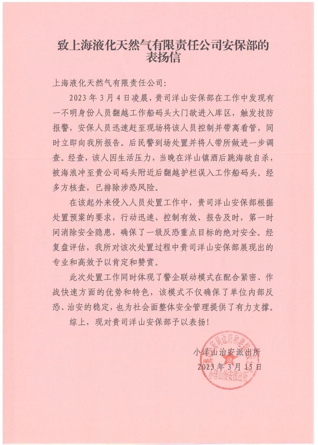 3月15日,宗保公司駐洋山天然氣項(xiàng)目收到小洋山治安派出所的表揚(yáng)信,信中對(duì)公司員工出色的工作表現(xiàn)給予了表揚(yáng)。