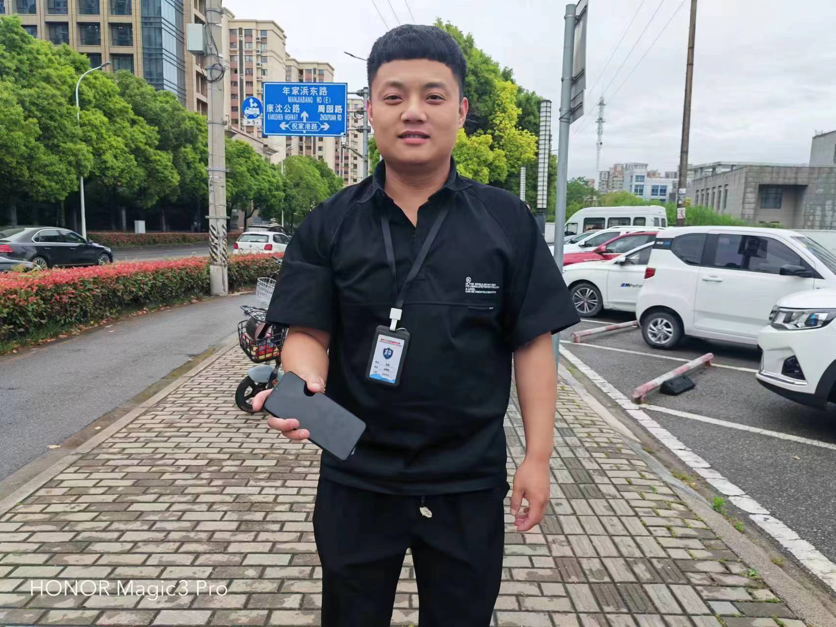 當(dāng)日6:20,公司員工陳鎮(zhèn)在昌運里儲運路值勤時,撿到一部黑色華為P40手機,詢問周圍人員無人認(rèn)領(lǐng)后,便將情況報告了項目負(fù)責(zé)人,并按指示邊值勤邊留意尋找物品的人。
