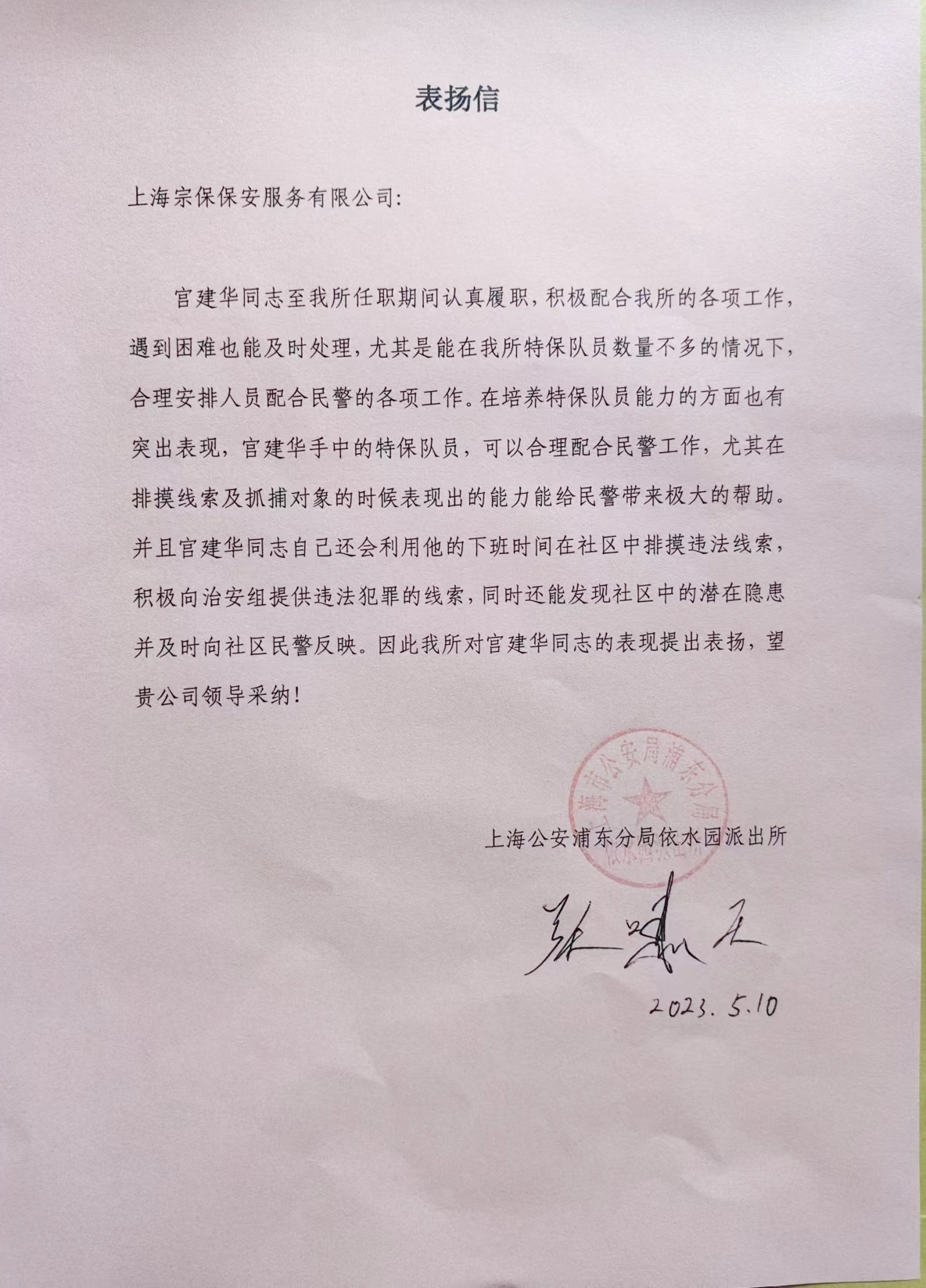5月10日,宗保公司駐浦東公安分局依水園派出所輔助項目收到依水園派出所副所長張嘯天的感謝信,信中對公司員工宮建華的工作表現(xiàn)給予了表揚。