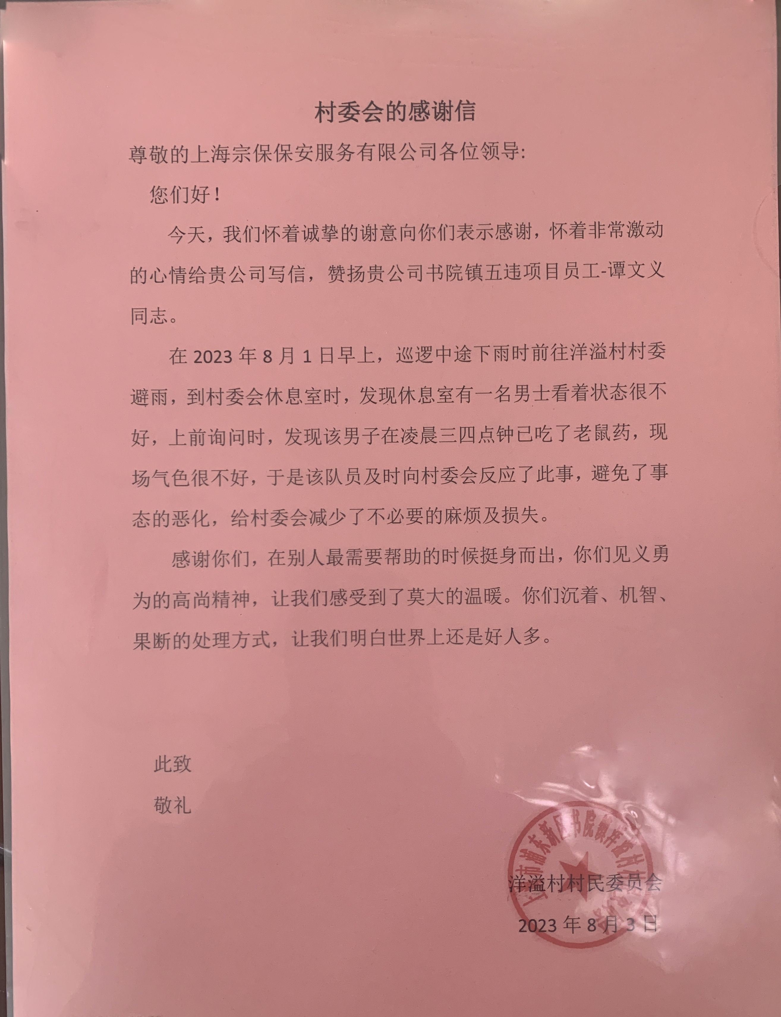 8月3日,宗保公司駐浦東臨港書院項目收到浦東新區(qū)書院鎮(zhèn)洋溢村村委會繡有“熱心為民 忠于職守”的錦旗和一封感謝信,感謝公司員工譚文義8月1日早上在村委會休息室避雨時,敏銳察覺一男子狀態(tài)不佳,詢問得知其吃了老鼠藥欲尋短見后,立即告知村委會,120及時趕到挽救男子生命的善舉。