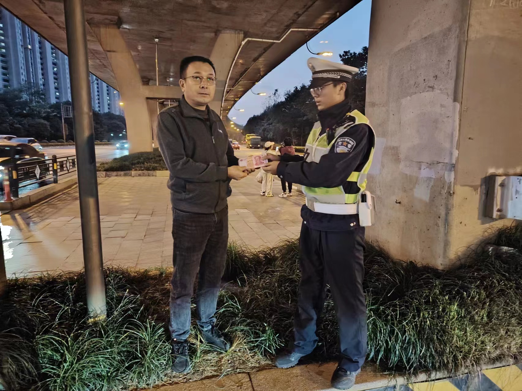11月16日16:50,公司員工李虎在天目山西路與閑富路交叉口值勤時,看見一沓現(xiàn)金從一輛黑色轎車里掉出來,便趕緊上前撿起,想要還給失主時轎車早已不見了蹤影。李虎數(shù)了數(shù)共有5420元,隨即將情況報告了閑林街道交通工作站。工作站通過調(diào)取查看路口監(jiān)控聯(lián)系上了車主,并告知其到天目山西路與閑富路交叉口領取。大約過了30多分鐘,黑色轎車車主趕到現(xiàn)場,李虎將現(xiàn)金如數(shù)歸還給了他。車主清點無誤后十分激動,一個勁地向員工李虎道謝。
