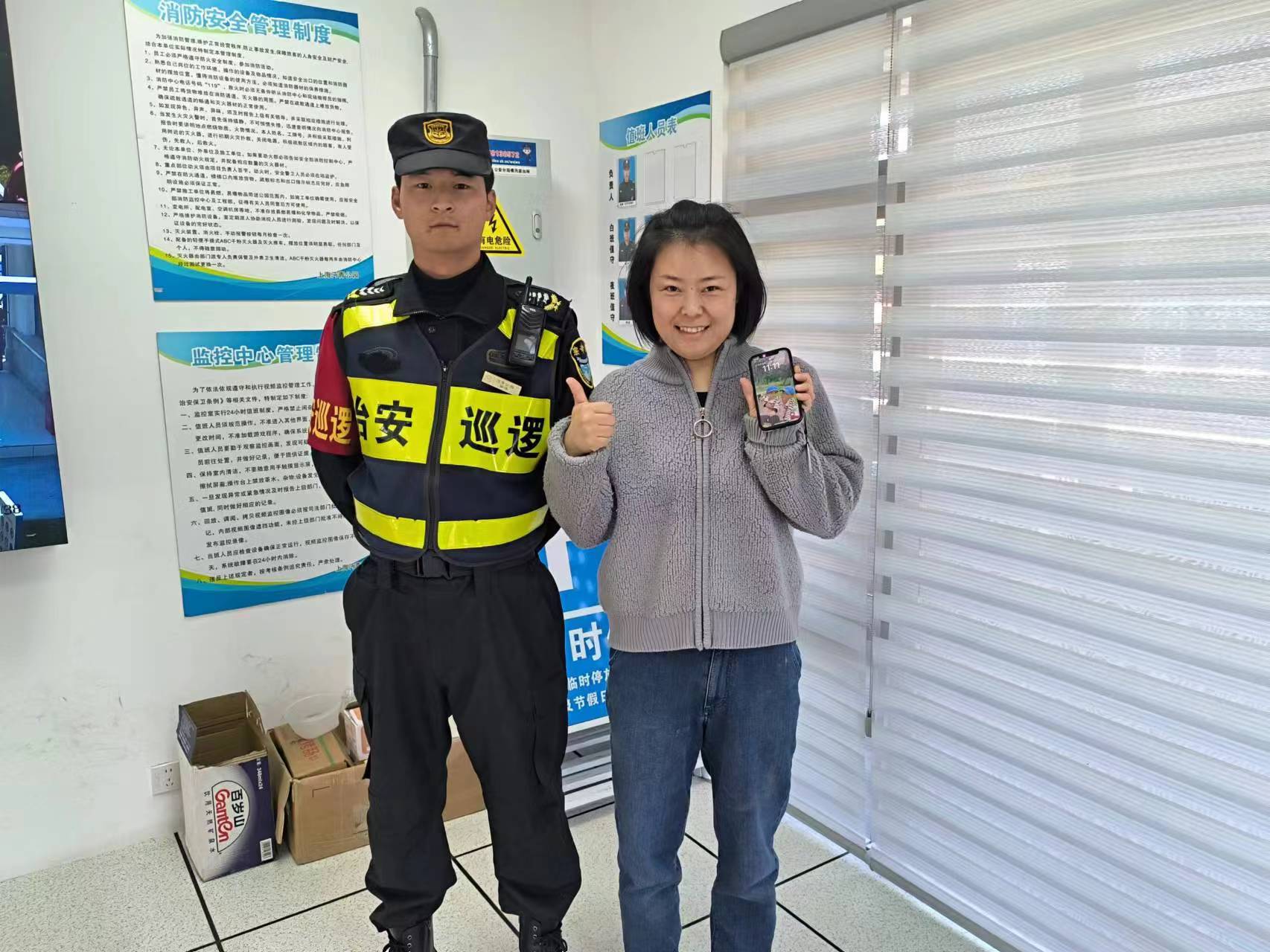 11月21日11:00,宗保公司駐浦東新區(qū)沔青公園員工王飛帆在值勤時,撿到一部蘋果手機(jī),隨即將情況報告了帶隊隊長,并按指示將手機(jī)送到公園監(jiān)控室。同時,王飛帆將撿到手機(jī)的消息發(fā)布在工作群,請在崗位值勤的同事幫忙留意失主。大概過了十幾分鐘,同事孫克看到一位女士邊走邊看,像在尋找什么東西,便主動上前詢問。女士說自己的手機(jī)在公園掉了,孫克詢問了女士手機(jī)的品牌、顏色等信息,隨后告訴女士到公園監(jiān)控室認(rèn)領(lǐng)。該女士很快趕到監(jiān)控室,成功解鎖手機(jī)密碼確認(rèn)其是失主后,等在監(jiān)控室的王飛帆將手機(jī)交還給了她。女士拿到手機(jī)很高興,連連向宗保員工王飛帆道謝。
