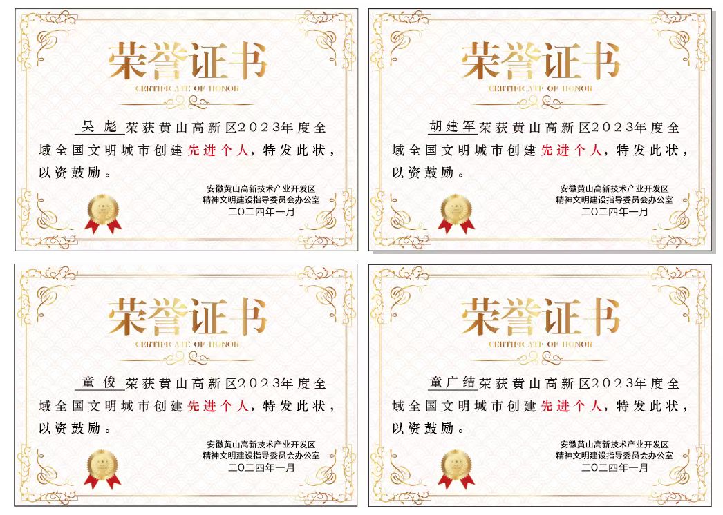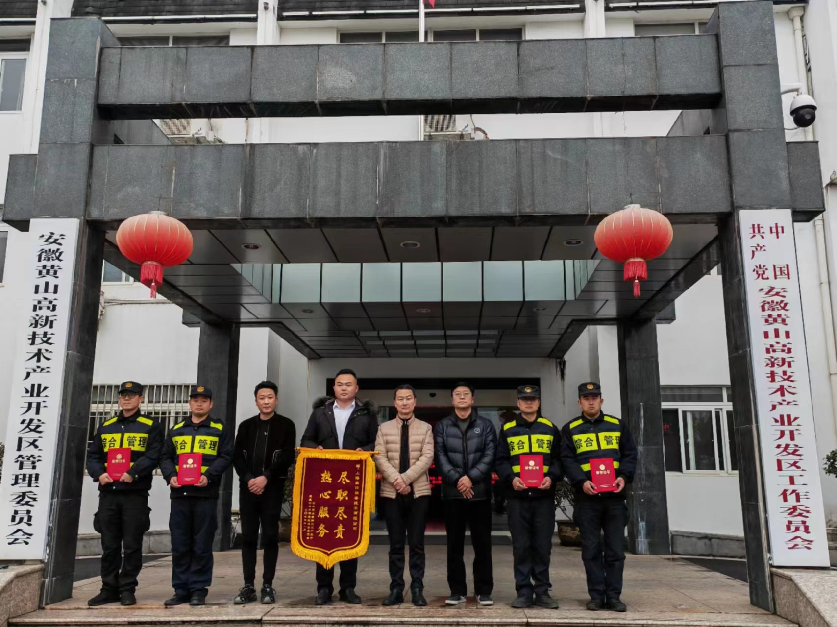 1月19日,安徽黃山高新技術(shù)產(chǎn)業(yè)開發(fā)區(qū)文明委常務(wù)副主任、管委會三級調(diào)研員汪衛(wèi)東將一面繡有“盡職盡責(zé) 熱心服務(wù)”的錦旗贈送給宗保公司項(xiàng)目負(fù)責(zé)人,并向公司項(xiàng)目員工吳彪、胡建軍、童俊、童廣結(jié)頒發(fā)先進(jìn)個(gè)人榮譽(yù)證書,感謝公司對開發(fā)區(qū)工作的大力支持和配合,贊揚(yáng)公司項(xiàng)目員工在協(xié)助開展市容環(huán)境管理、社會綜合治理和全國文明城市創(chuàng)建等工作中的出色表現(xiàn)。