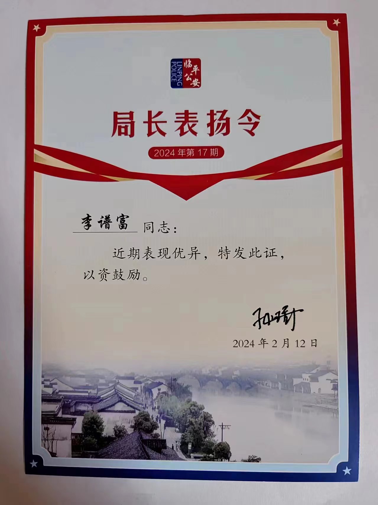 2月8日,浙江民泰駐杭州市臨平區(qū)南苑派出所輔助項(xiàng)目收到臨平區(qū)公安分局孫琦局長簽發(fā)的17號《局長表揚(yáng)令》,對公司員工李譜富協(xié)助抓獲盜竊嫌疑人的出色表現(xiàn)給予表揚(yáng)。