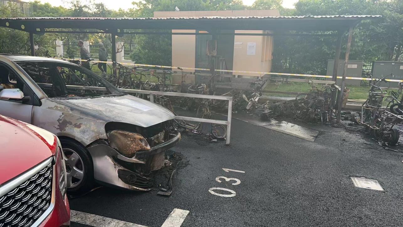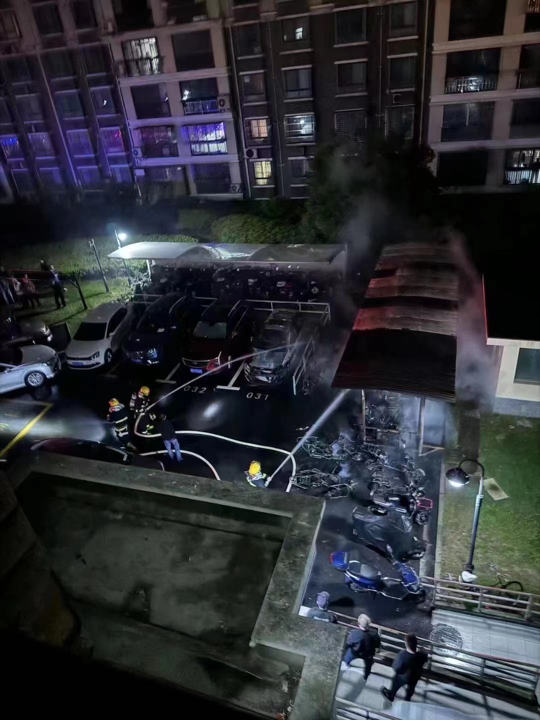 兩人火速趕到現(xiàn)場,發(fā)現(xiàn)車棚內(nèi)多輛電動自行車正在猛烈燃燒,火勢較大濃煙滾滾,同時還夾雜著噼噼啪啪的聲音,更為嚴重的是車棚旁還停放著5輛汽車,火勢如得不到及時有效控制,不但會造成巨大的財產(chǎn)損失,而且還會威脅到小區(qū)居民的生命安全。