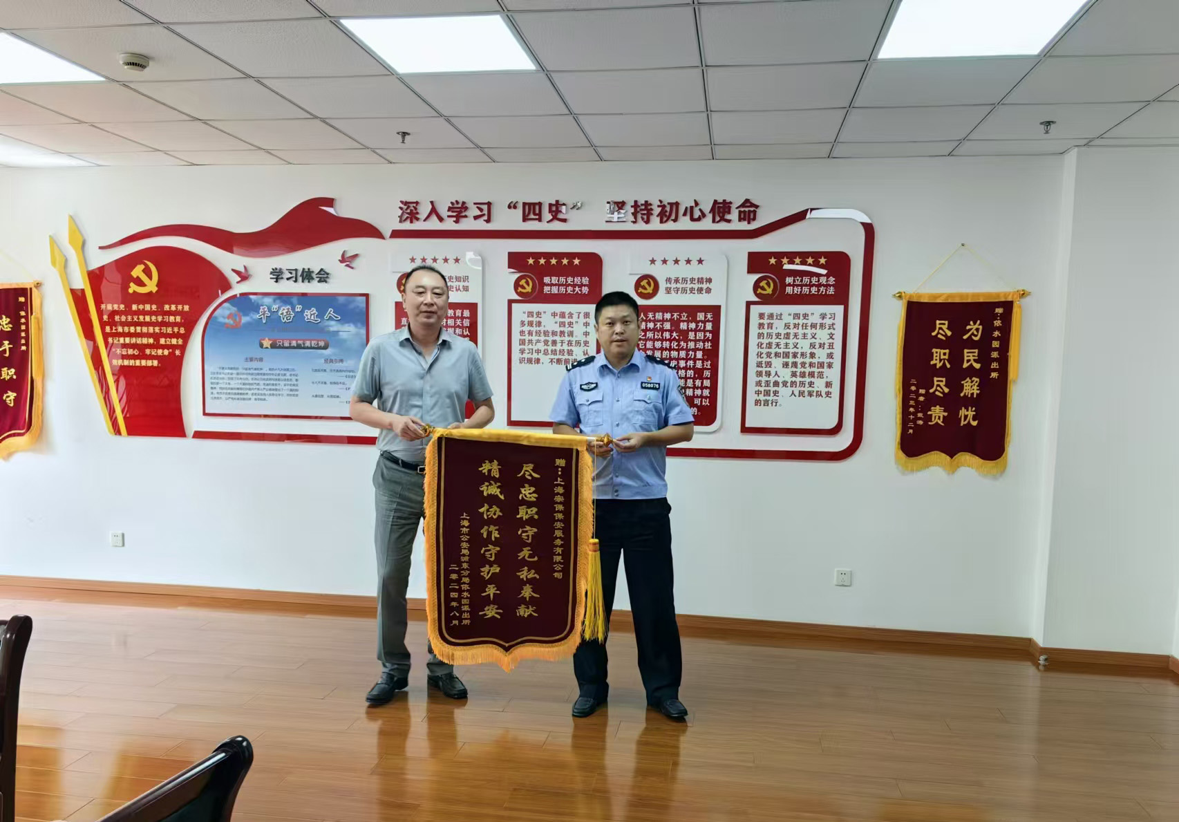 8月29日,上海浦東新區(qū)公安分局依水園派出所教導(dǎo)員薛春華將一面繡有“盡忠職守?zé)o私奉獻(xiàn) 精誠(chéng)協(xié)作守護(hù)平安”的錦旗贈(zèng)送給宗保公司董事長(zhǎng)王耀,感謝公司對(duì)依水園派出所工作的大力支持。