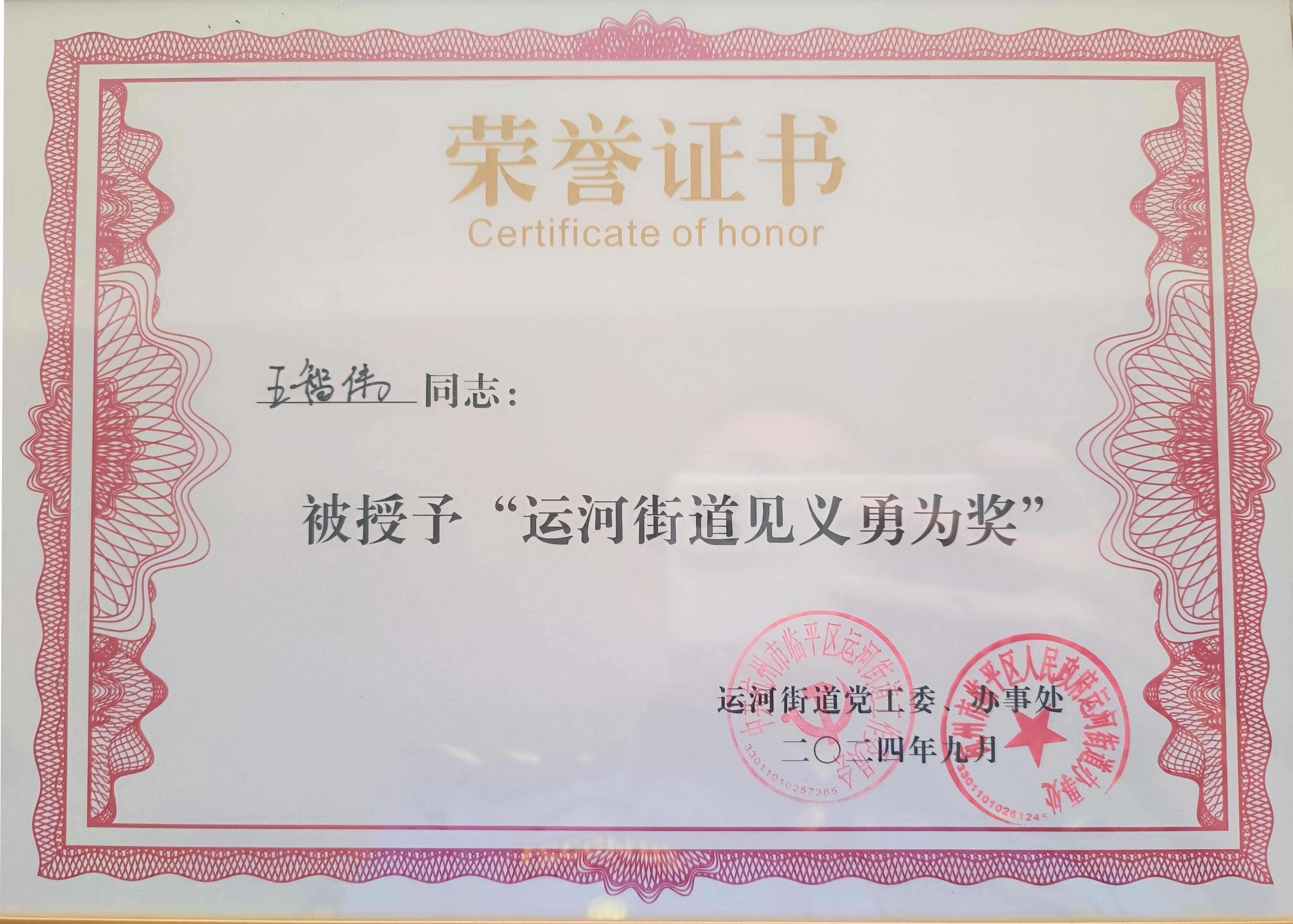 9月14日,浙江民泰公司駐杭州市臨平區(qū)運(yùn)河市容項(xiàng)目3名員工被運(yùn)河街道黨工委、辦事處授予“運(yùn)河街道見(jiàn)義勇為獎(jiǎng)”。