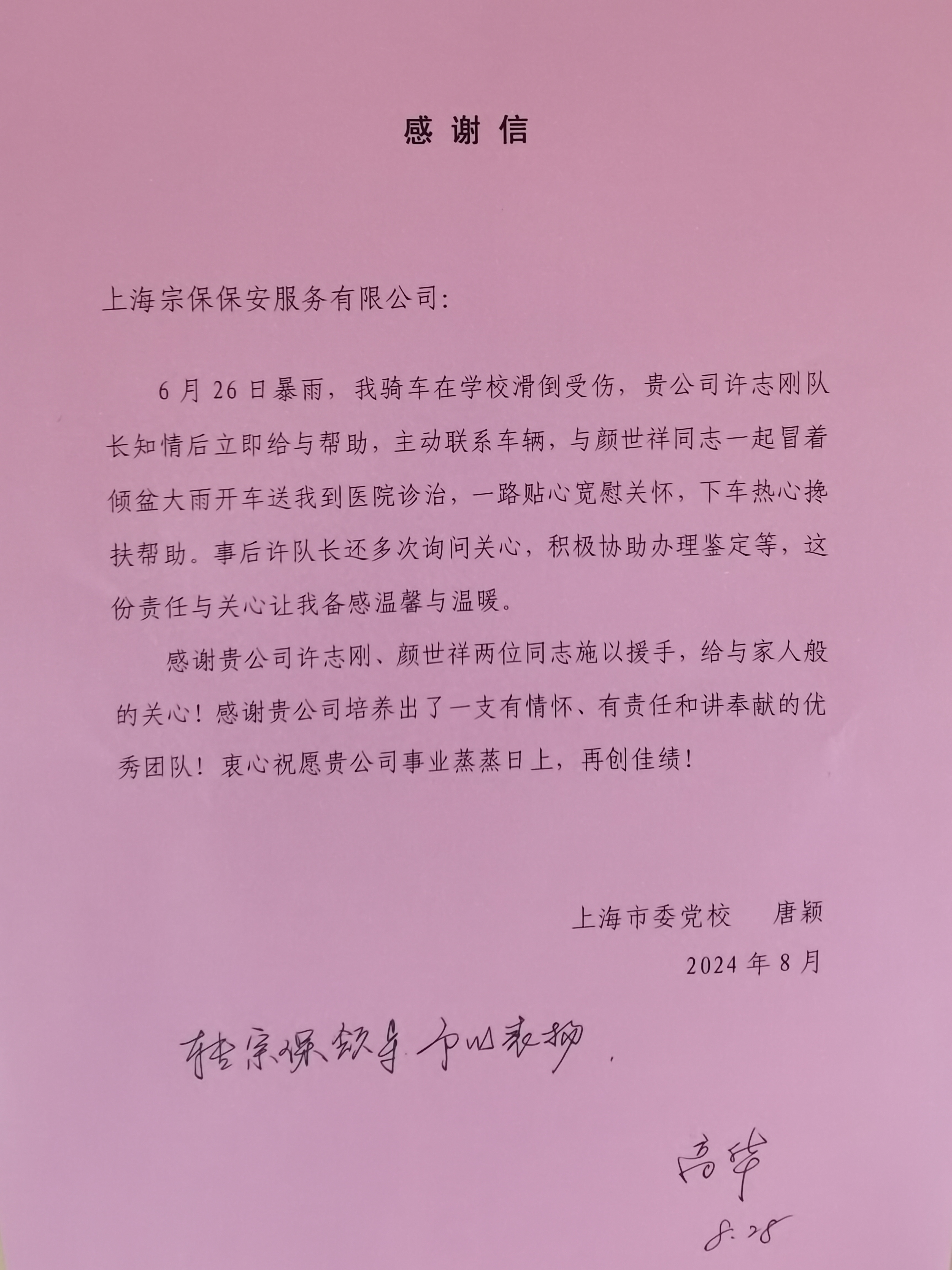8月28日,宗保公司駐徐匯區(qū)市委黨校項(xiàng)目收到黨校老師唐女士送來(lái)的一封感謝信,感謝公司員工許志剛和顏世祥熱心助人的行為。