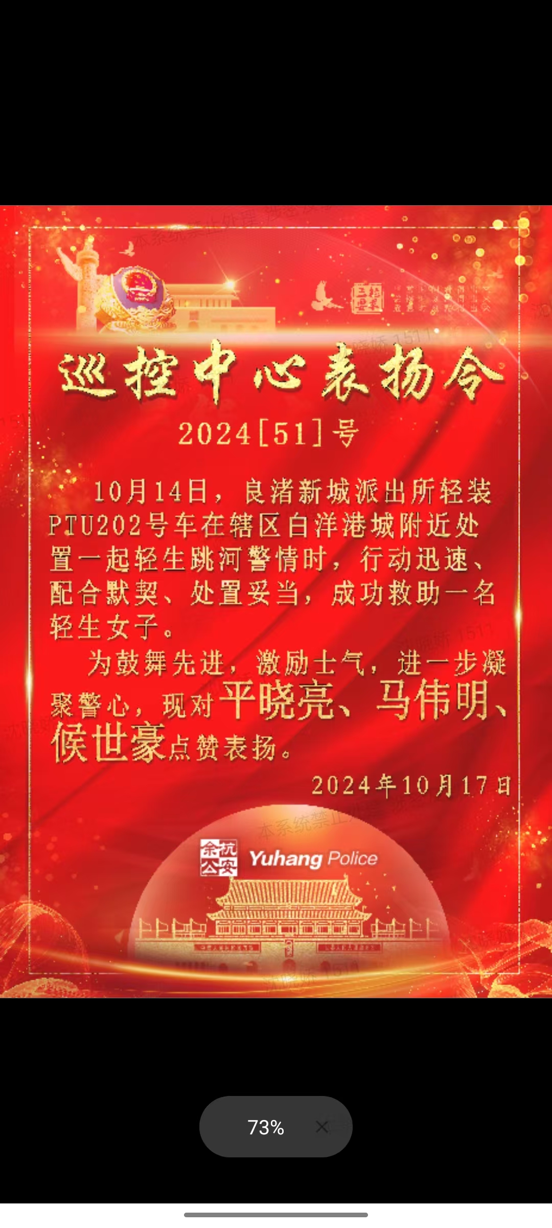 10月14日,浙江民泰駐杭州市余杭區(qū)良渚新城派出所輔助項(xiàng)目員工助力成功救下一名欲跳河輕生女子。