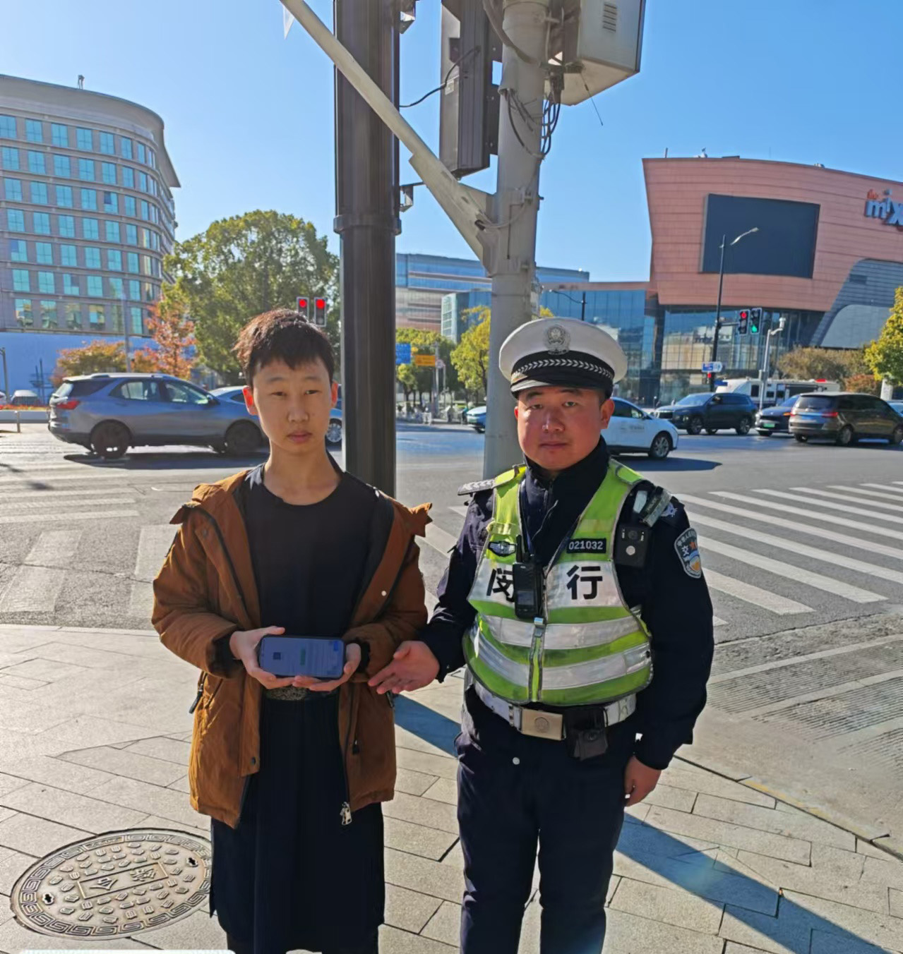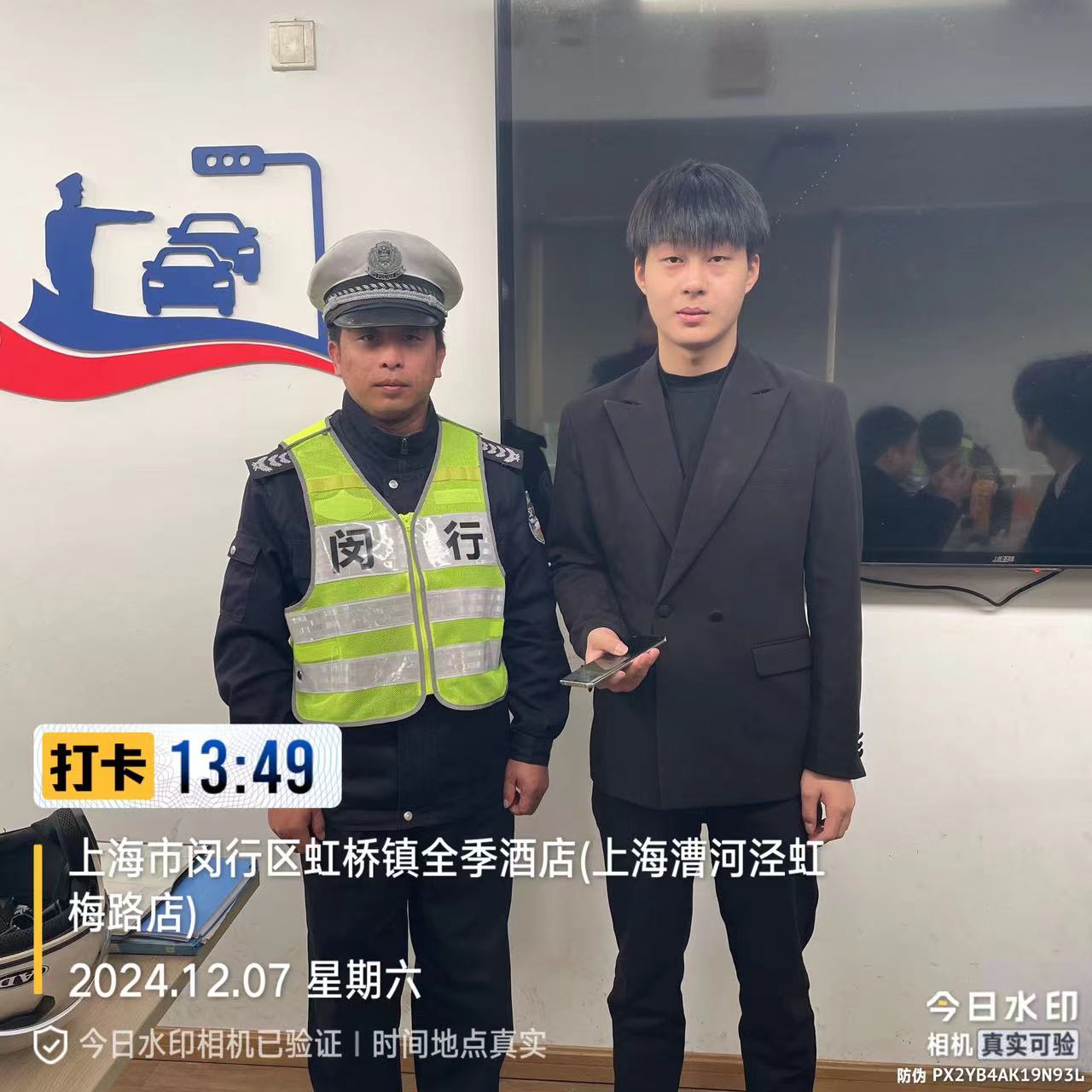 12月7日13:49,一位身穿黑色西裝的男士趕到吳中路虹許路交警崗亭認領手機。丁雄師核實確認男士是失主后,隨即將手機交還給了他。男士拿到手機,連連稱贊丁雄師拾金不昧的助人行為。