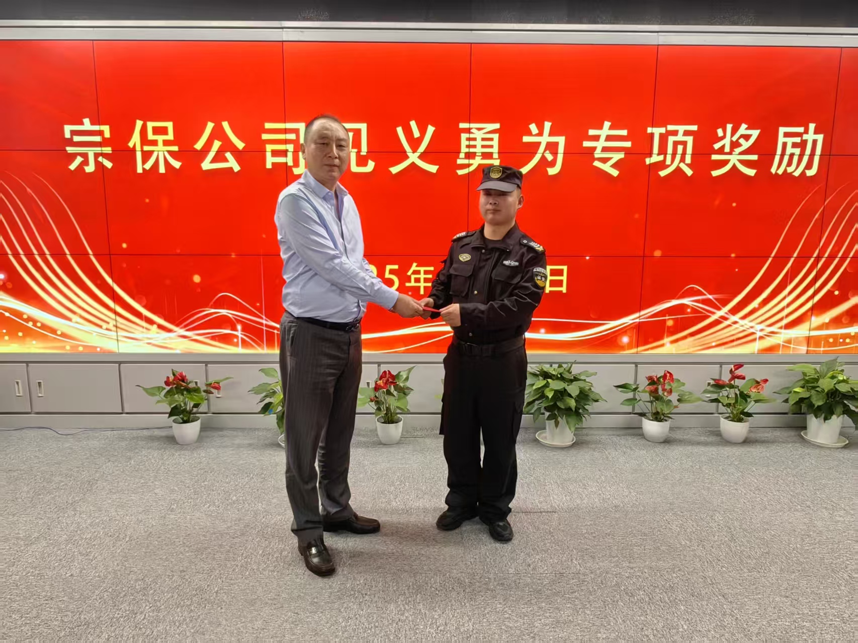 3月26日,上海宗保保安服務有限公司在浦東新區(qū)周浦基地舉行儀式,向在值勤期間成功化解突發(fā)事件的員工何征明頒發(fā)公司見義勇為專項獎勵。