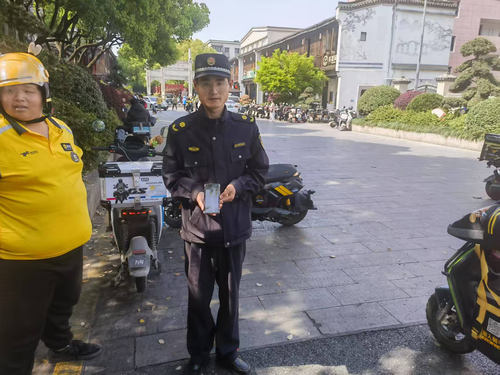 4月6日14:19,浙江民泰公司駐杭州市臨平區(qū)塘棲市容項(xiàng)目員工陳亞會(huì)和梁小睿在塘棲古鎮(zhèn)景區(qū)門口執(zhí)勤時(shí),撿到一部小米手機(jī),報(bào)告城管中隊(duì)值班領(lǐng)導(dǎo)后,便在原地等待失主。