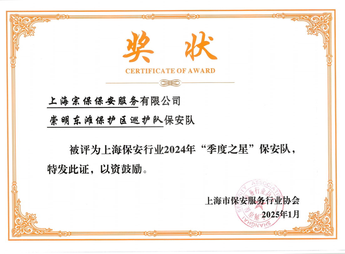 近日,上海市保安服務(wù)行業(yè)協(xié)會公布了“忠誠衛(wèi)士”保安員、“年度之星”保安隊、“季度之星”保安隊、“年度之星”保安員評選結(jié)果,宗保公司2個項目保安隊和3名員工個人獲得殊榮。