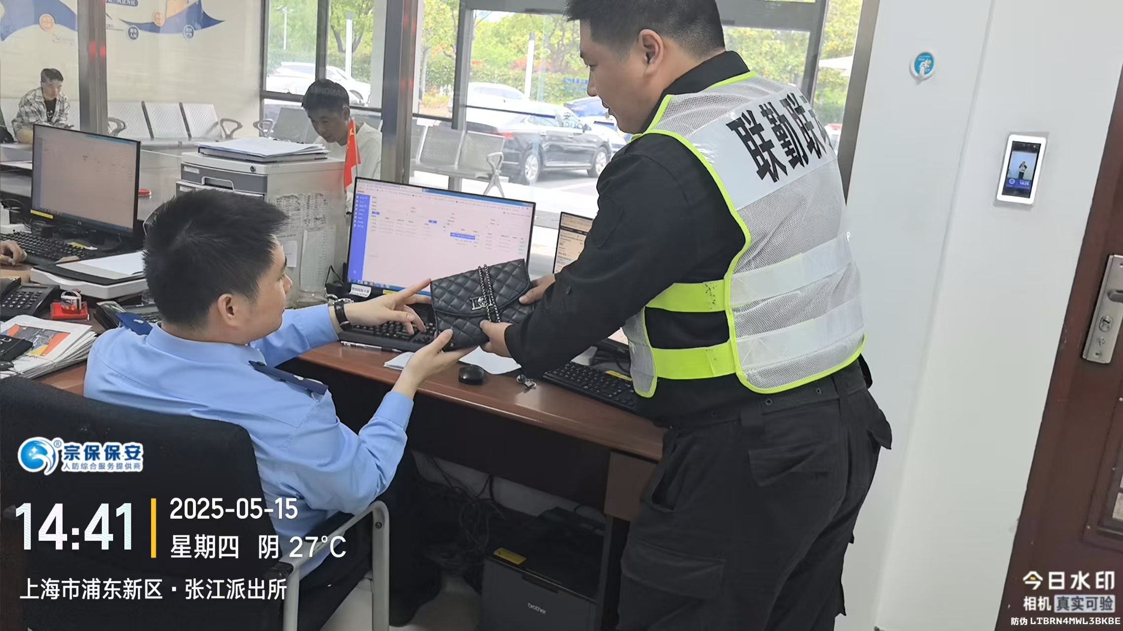 宗保公司駐浦東新區(qū)張江派出所輔助項(xiàng)目員工撿到女士挎包上交民警