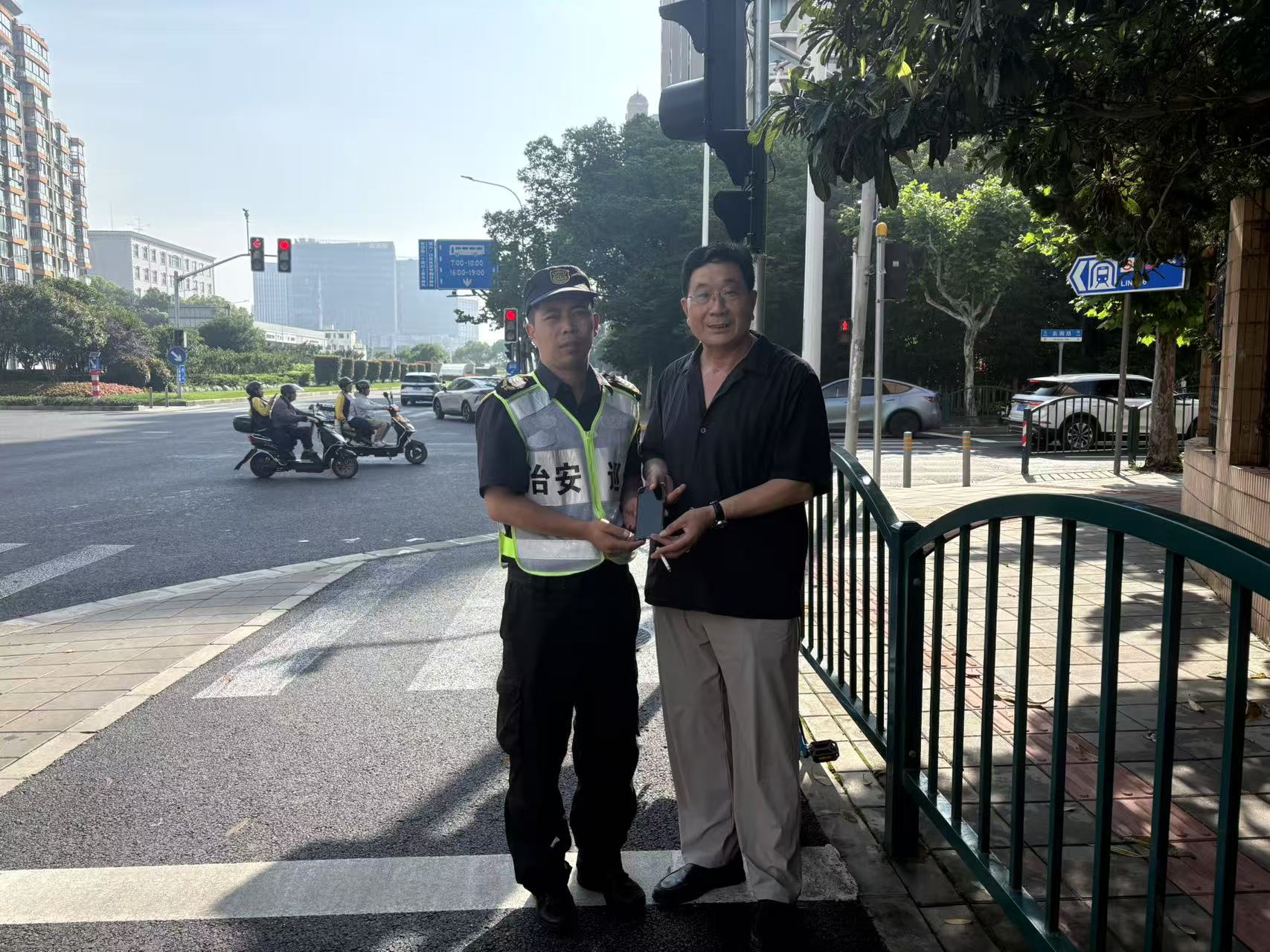 6月12日17:40,浙江民泰公司駐杭州市余杭區(qū)五常街道市容項(xiàng)目員工李天浩和牟倫申在五常街道荊長路與天竺路交叉口執(zhí)勤時(shí),撿到一部VIVO手機(jī),隨即報(bào)告了帶班組長,并在原地邊執(zhí)勤邊等待失主。