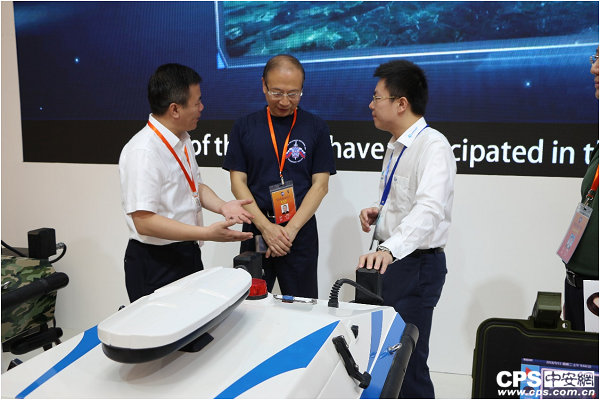 江蘇省公安廳黨委副書記、副廳長(zhǎng)尚建榮(中),連云港市副市長(zhǎng)、市公安局局長(zhǎng)王永生(左)在云洲展位詳細(xì)了解云洲安防無人艇