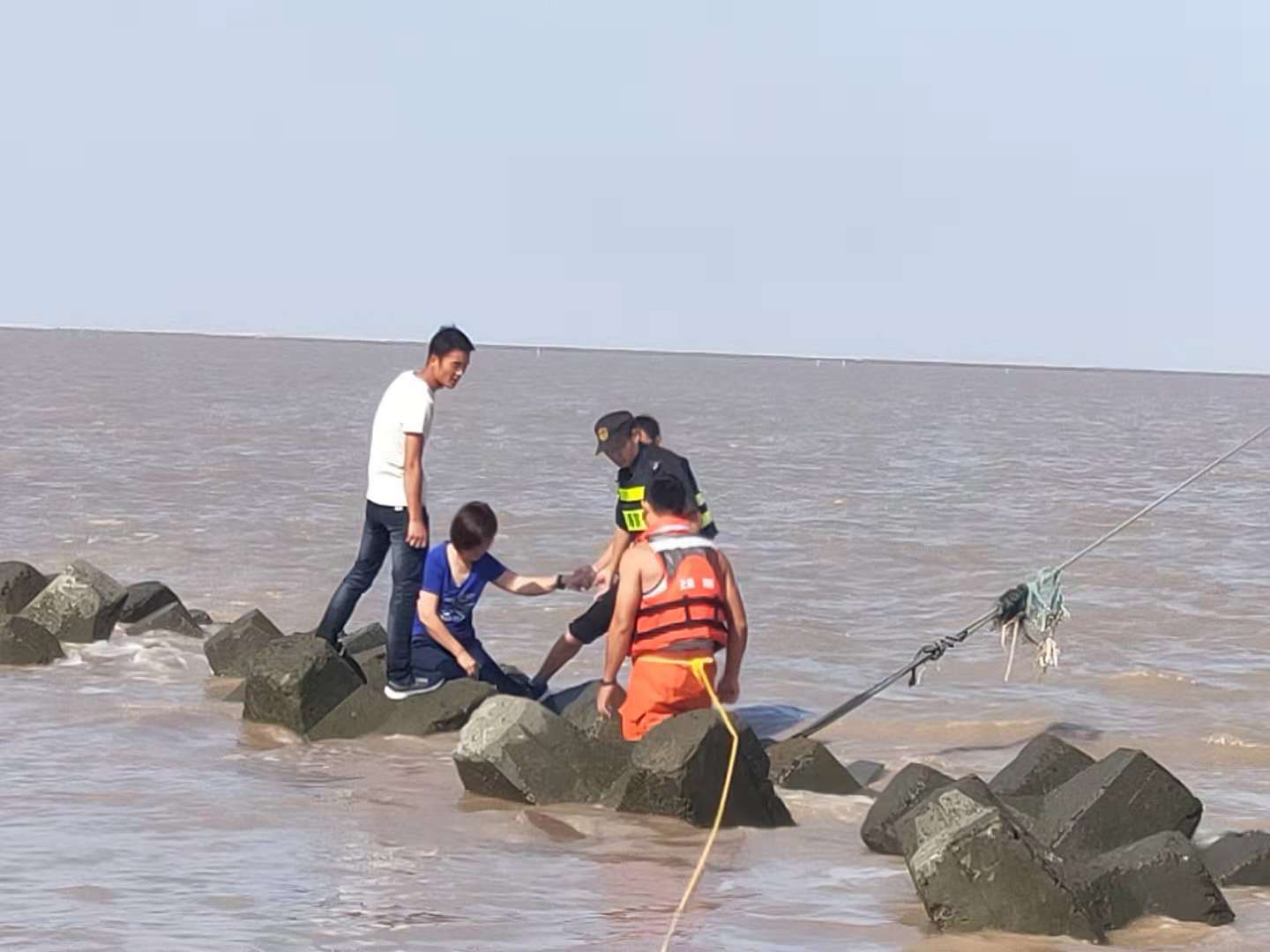 “快看那邊,水里有人?!?0月2日下午14:10,宗保特保隊員在海堤上巡查時,發(fā)現(xiàn)在海水中的礁石上困著一對青年男女。當時,海水不斷上漲,很快就要淹沒礁石,兩名游客緊張得瑟瑟發(fā)抖,情況危急。
