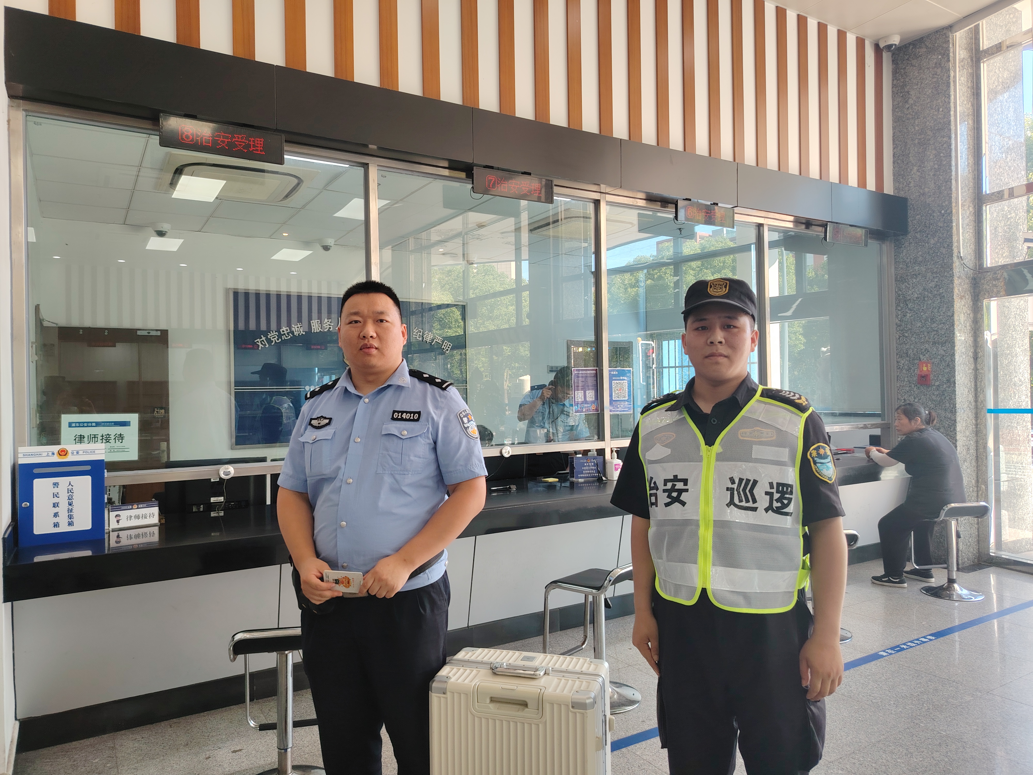 7月5日14:30,宗保公司駐浦東新區(qū)公安分局洋涇派出所輔助項(xiàng)目員工黃健和韓邁巡邏至楊高中路地鐵站1號(hào)口時(shí),撿到一個(gè)行李箱,內(nèi)有一臺(tái)筆記本電腦和若干衣物。