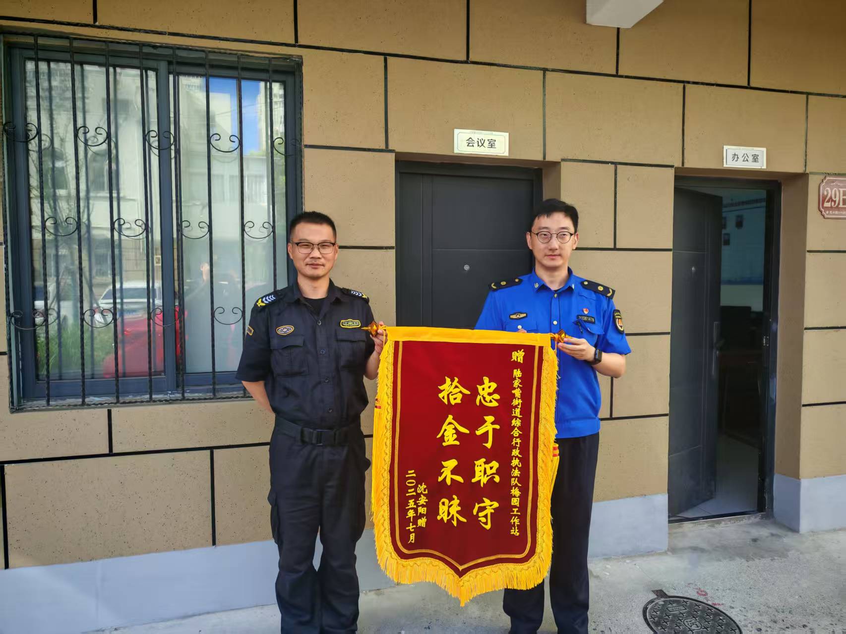 7月21日8:30,男子又特意趕到陸家嘴城管中隊(duì),送來一面繡有“拾金不昧 忠于職守”的錦旗,對(duì)宗保公司員工陳軍拾金不昧的行為表達(dá)誠摯的謝意。 (供稿人:孫富超)06