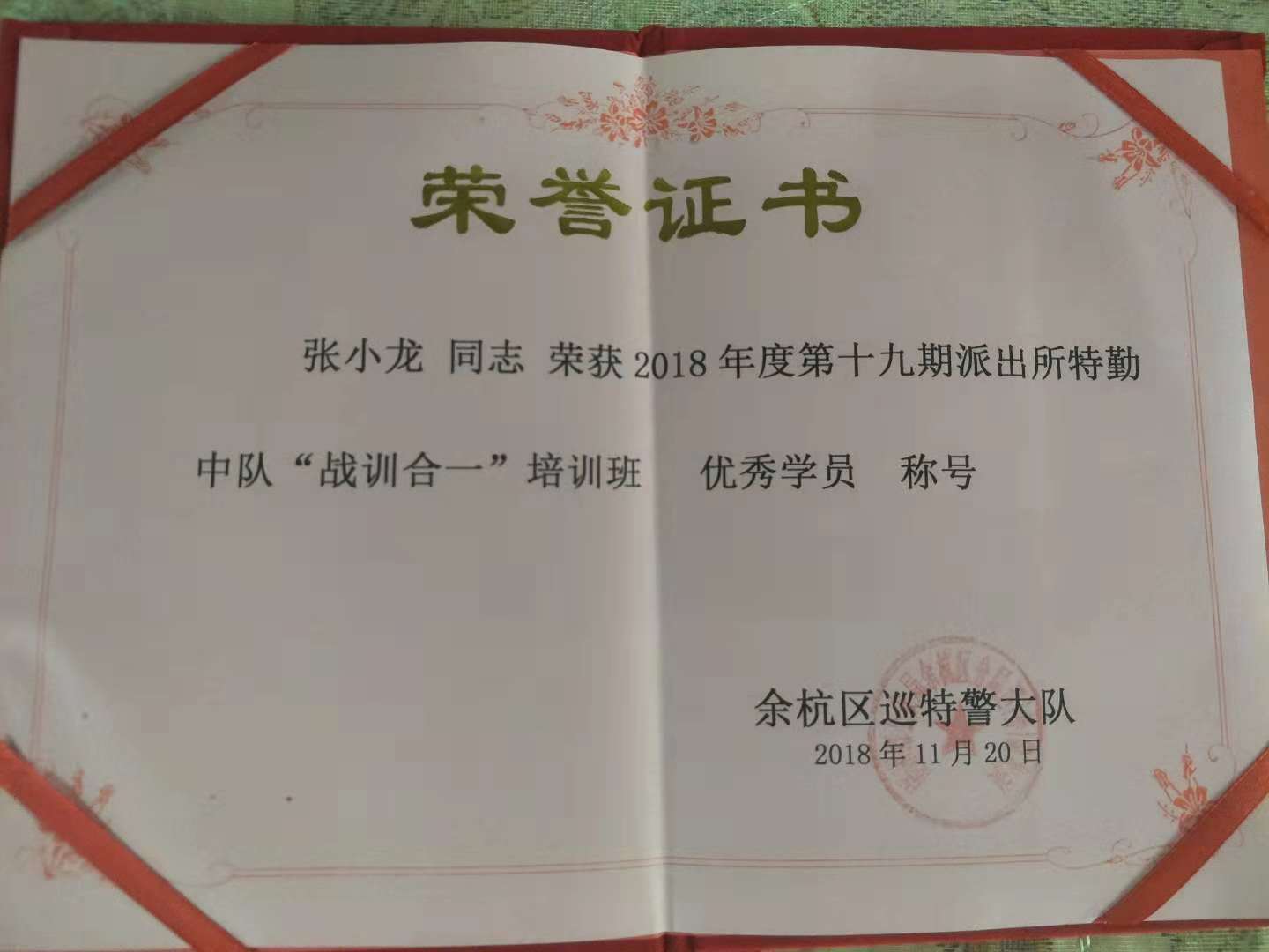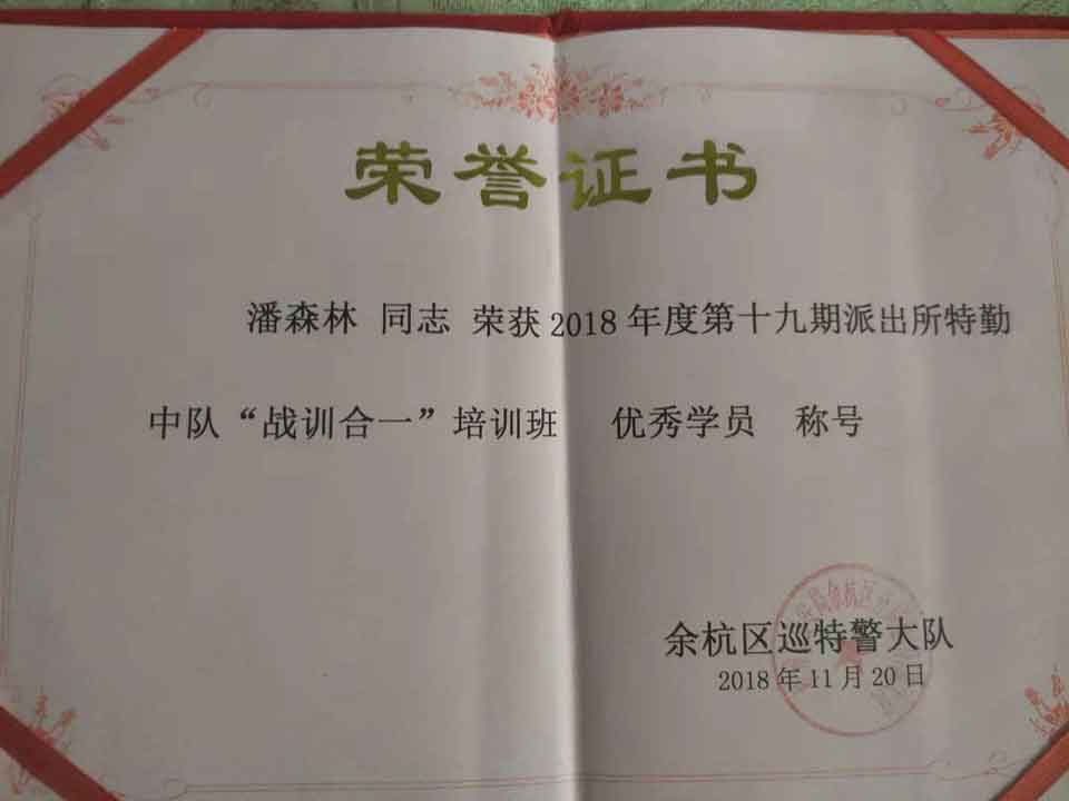 功夫不負(fù)有心人,經(jīng)過嚴(yán)格的理論考試和實(shí)戰(zhàn)考核,張小龍和潘森林二位學(xué)員表現(xiàn)尤為突出,榮獲了余杭區(qū)巡特警大隊(duì)頒發(fā)的榮譽(yù)證書 —— 2018年度第十九期派出所特勤中隊(duì)“戰(zhàn)訓(xùn)合一”培訓(xùn)班優(yōu)秀學(xué)員稱號(hào)。