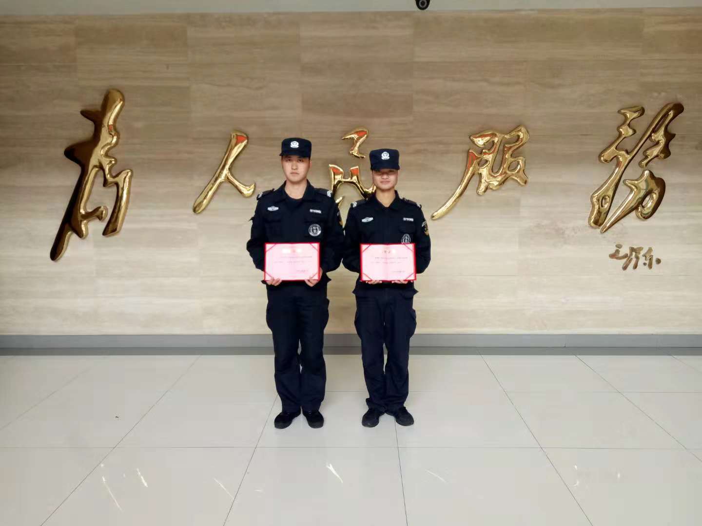 11月20日下午,民泰(宗保)五常項(xiàng)目特保隊(duì)員張小龍和潘森林拿著優(yōu)秀學(xué)員證書,激動(dòng)萬分。