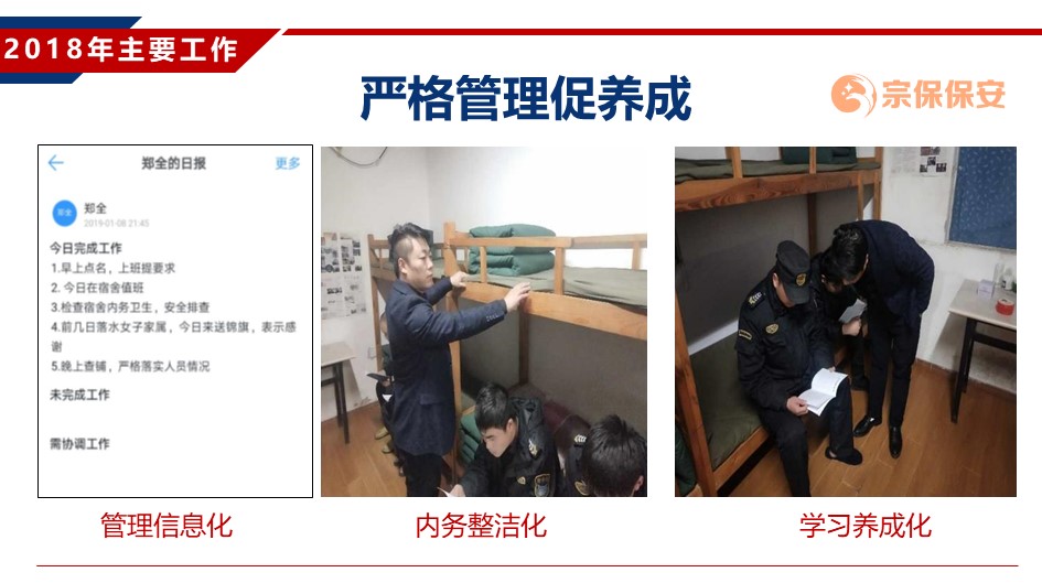 不忘初心,牢記使命。2018年,全公司配合城管勸導(dǎo)流動攤販857924起,勸阻跨門經(jīng)營約738923起,引導(dǎo)、擺放車輛1839682輛;配合民警盤查人員375985人、盤查非機動車493453次、盤查機動車83672次、登記人口80多萬;配合交警清查非法營運車輛7853輛、交通疏導(dǎo)596853人次。天量數(shù)據(jù)的背后,是宗保人對自己承諾的嚴(yán)格落實,對甲方單位的認(rèn)真負(fù)責(zé),對業(yè)務(wù)工作的一絲不茍。