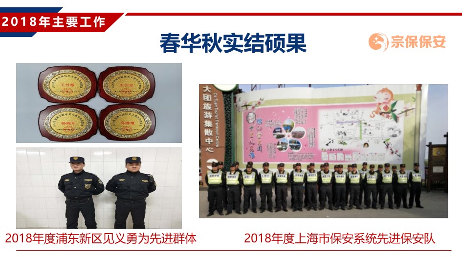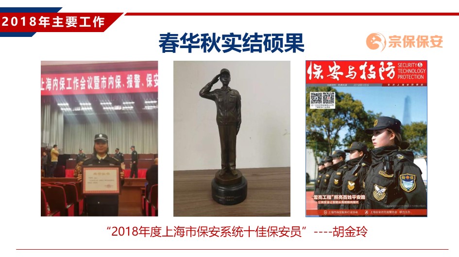 春風(fēng)浩蕩滿目新,不負(fù)韶光萬里程。胡金玲被評為“2018年度上海市保安系統(tǒng)十佳保安員”,宗保保安駐大團鎮(zhèn)城管輔助中隊被評為“2018年度上海市保安系統(tǒng)先進保安隊”,王少軍、王付振等被評為“2018年度浦東新區(qū)見義勇為先進群體”。