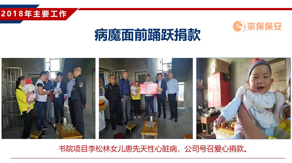 病魔無情,小孩重病陷困境;宗保有愛,踴躍捐款暖人心。2018年2月書院項目隊員李松林的女兒查出患先天性心臟病。高額的手術(shù)費使這個本就不富裕的家庭雪上加霜。病魔無情人有情。公司發(fā)出“愛心捐款、情暖員工”號召,隊員們紛紛伸出援助之手,慷慨解囊,獻出自己的一份愛心。一時間,公司形成了一片“愛的海洋”。一筆筆捐款匯聚著一股股暖流,短短幾日,便募集愛心捐款70460元。捐款活動充分體現(xiàn)了公司廣大員工團結(jié)友愛、互幫互助的美德;彰顯了公司奉獻、友愛、互助、進步的時代新風(fēng)。