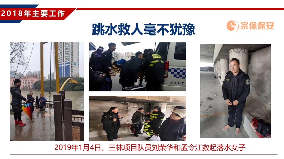 疾風(fēng)知勁草,危急見忠誠。2019年1月4日,三林項目隊員劉榮華和孟令江巡邏執(zhí)勤時,發(fā)現(xiàn)有一名女子落水,情況十分危險。劉榮華迅速跳入水中施救;孟令江用繩索配合救援,兩人合力將女子救起。劉榮華和孟令江只是無數(shù)宗保好人的具體代表。2018年,全公司共交還遺失財物20多萬元,拒收賄賂10多萬元,找回走失兒童9人,300多人次打不還手、罵不還口,堅持文明值勤?!吧蠉徧峁┓?wù),微笑增添力量,刁難接受考驗,忍辱造就和諧”的服務(wù)理念已經(jīng)深深烙在每一名宗保人的心中。