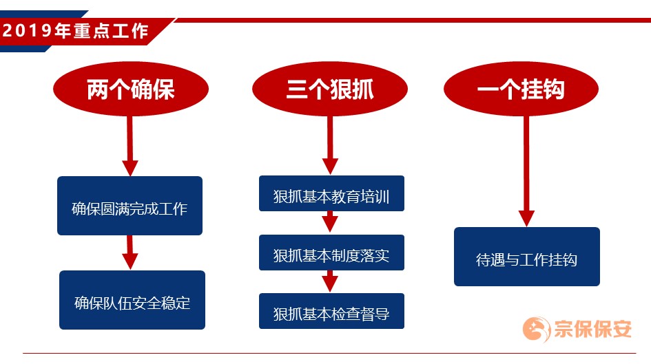 兩個確保:就是確保圓滿完成甲方交給的各項工作,確保隊伍安全穩(wěn)定。前者是使命所系、職責(zé)所在,沒有這個確保,公司和隊員就沒有存在的價值和作用;后者是根本保證和依托,沒有這個確保,一切工作都是空話,只能是水中月、鏡中花。
