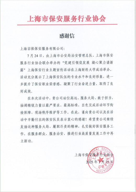 7月25日,宗保公司收到上海市保安服務(wù)行業(yè)協(xié)會的感謝信,感謝公司對由上海市公安局治安管理總隊、上海市保安服務(wù)行業(yè)協(xié)會聯(lián)合舉辦的“黨建引領(lǐng)促發(fā)展 凝心聚力譜新篇”上海保安行業(yè)主題宣傳活動的大力支持和鼎力配合,贊揚公司員工在服務(wù)保障和秩序維護的出色表現(xiàn),衷心感謝公司員工們在此次活動中的辛勤付出!