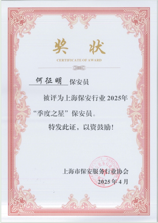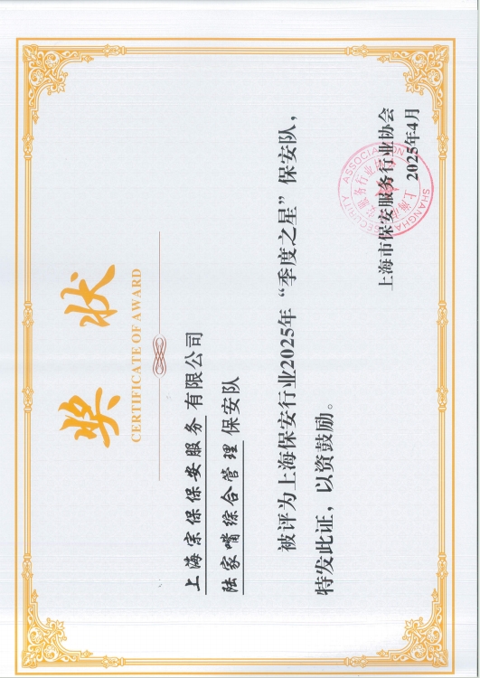 近日,上海市保安服務(wù)行業(yè)協(xié)會(huì)公布了“季度之星”保安隊(duì)、“季度之星”保安員評(píng)選結(jié)果,宗保公司1個(gè)項(xiàng)目保安隊(duì)和3名員工個(gè)人獲得殊榮。