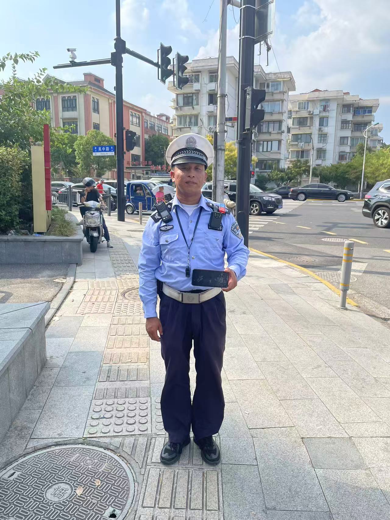 9月6日15:00,宗保公司駐閔行區(qū)虹橋交管輔助項(xiàng)目員工丁雄獅在吳中路虹許路路口執(zhí)勤時,撿到一部VIVO手機(jī)。詢問路人無果后,便將情況報(bào)告了帶班組長,并按指示在原地邊執(zhí)勤邊等待失主。