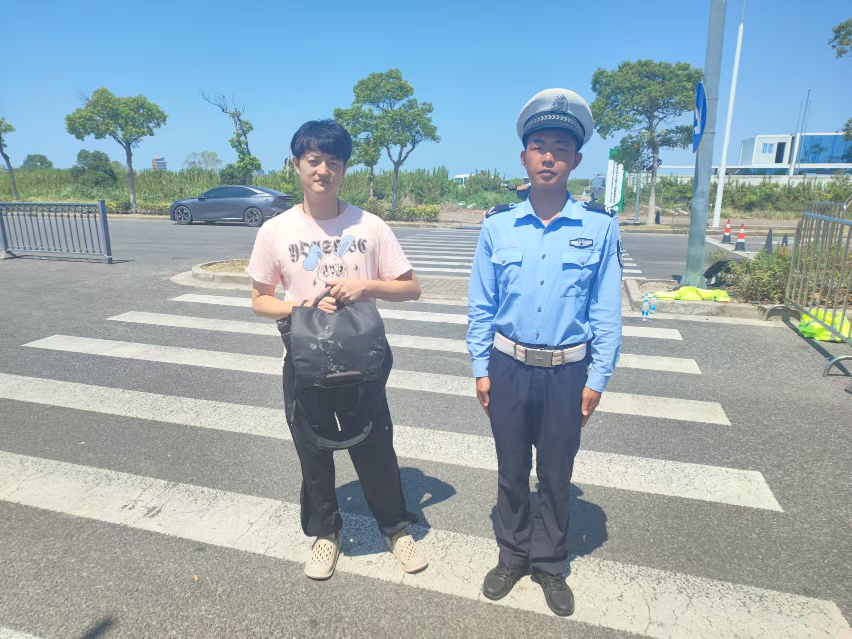 9月6日9時許,宗保公司員工侯林森在臨港海堤執(zhí)行交通管控任務(wù)期間,撿到一個黑色背包,內(nèi)有一部相機(jī)和一張身份證。侯林森第一時間將情況報(bào)告了班組長,并主動留在原地等候失主認(rèn)領(lǐng)。