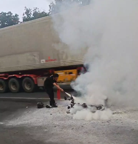 當(dāng)天5時(shí)15分,公司員工李風(fēng)雷在同順大道777號附近執(zhí)勤時(shí),發(fā)現(xiàn)一輛正在行駛中的電瓶車突然冒煙起火。更令人擔(dān)憂的是,駕駛員已被竄出的火焰灼傷,且事發(fā)地點(diǎn)緊鄰?fù)?康募ㄜ囕v,若火勢蔓延,極有可能引發(fā)連環(huán)險(xiǎn)情。