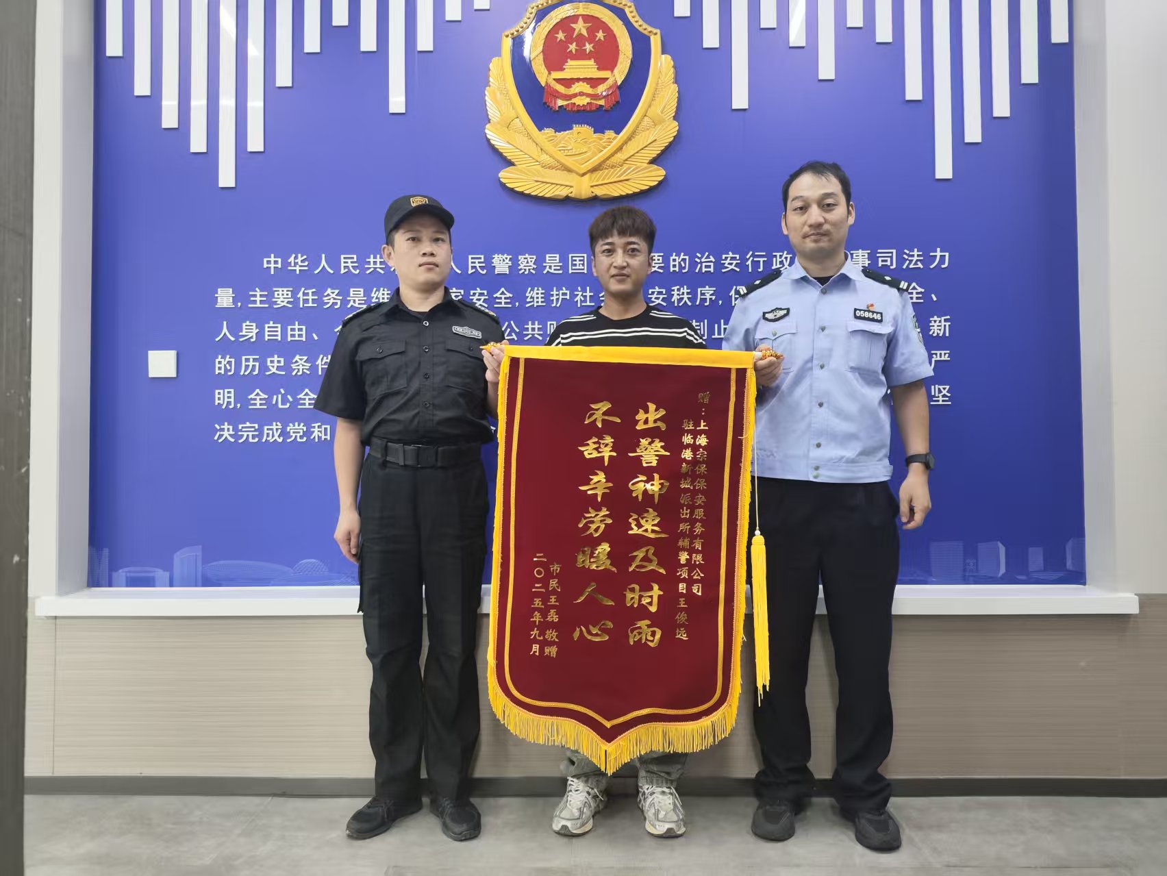 近日,宗保公司駐浦東新區(qū)臨港新城派出所輔助項目員工王俊遠(yuǎn),因協(xié)助民警成功幫助市民王先生找回遺失手機,獲得群眾贊譽,并獲贈一面寫有“出警神速及時雨,不辭辛勞暖人心”的錦旗。