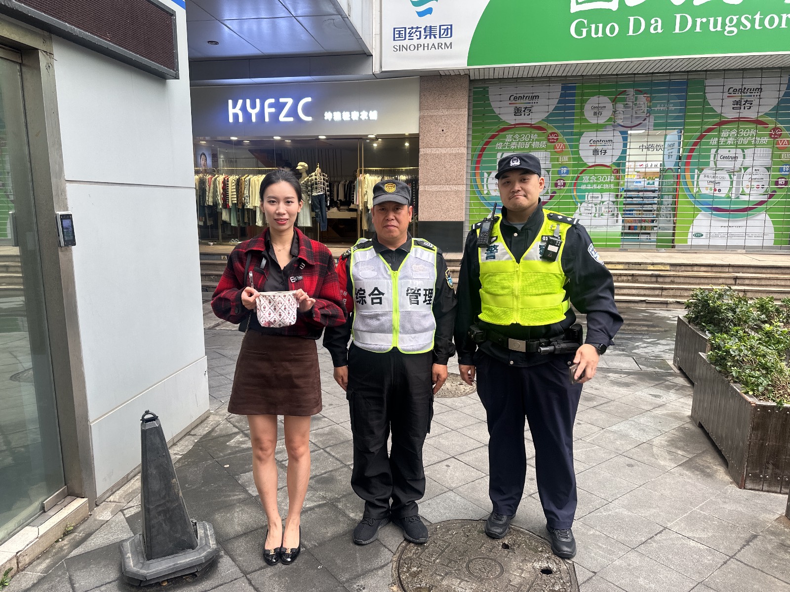 14:50左右,一位身穿紅色格子外套的女士在民警的陪同下趕來現場尋找。經民警確認后,漆貴成將小包和其中物品歸還給了女士。
