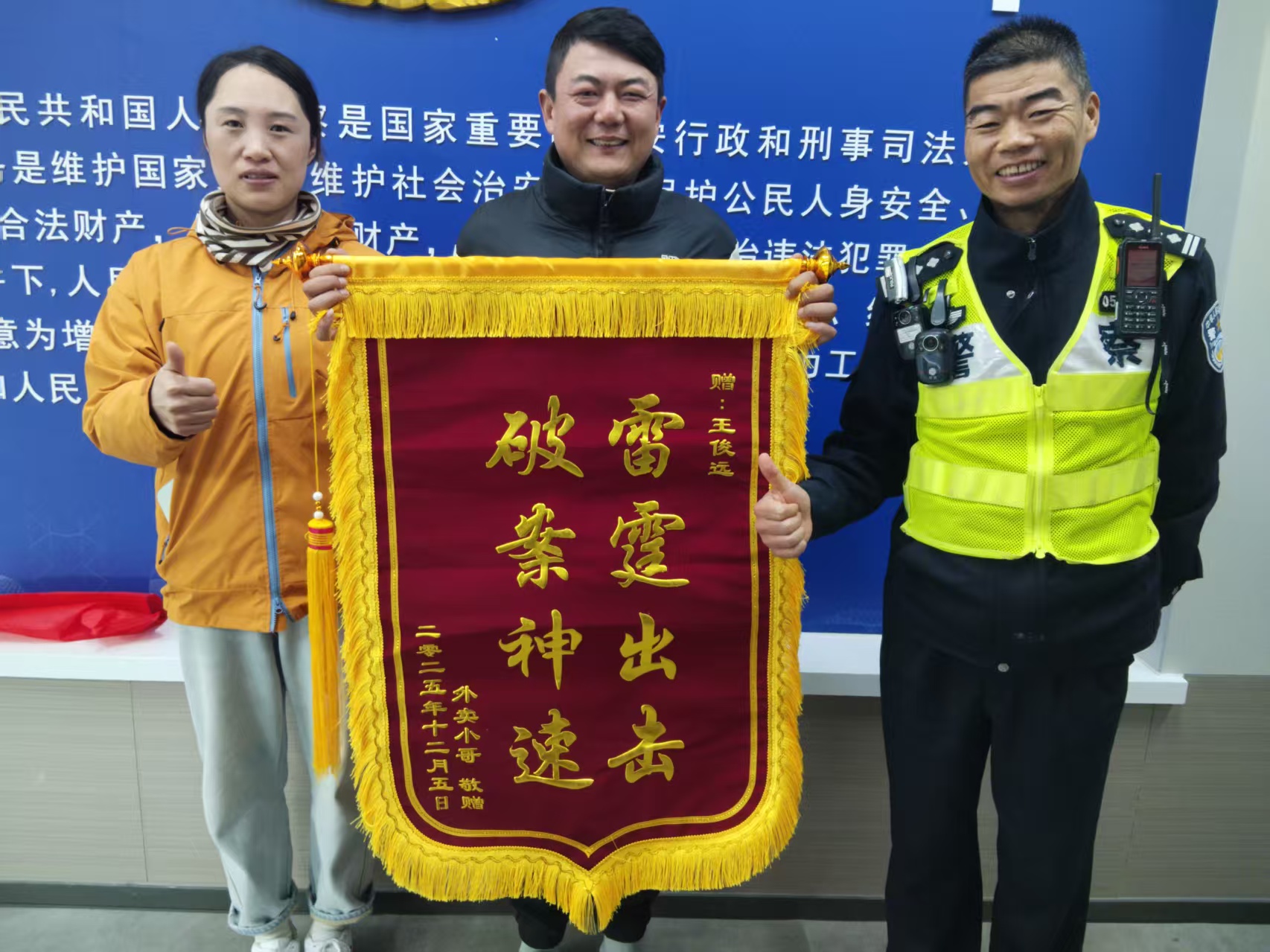 12月4日,宗保公司駐浦東新區(qū)臨港新城派出所輔助項(xiàng)目員工王俊遠(yuǎn)在協(xié)助民警處置一起警情時,憑借高度的工作責(zé)任心與細(xì)致耐心的工作態(tài)度,成功幫助市民宋女士追回被盜外賣,贏得市民真摯贊譽(yù)。事后,宋女士專程送來一面繡有“雷霆出擊 破案神速”的錦旗,表達(dá)對王俊遠(yuǎn)及派出所高效為民工作的充分肯定與衷心感謝。