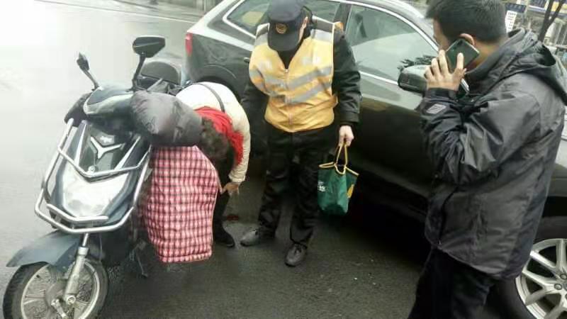 當(dāng)日08:15左右,金橋市容項目隊員孫雪曉、馮建平巡邏至浙橋路金新路口時,突然聽到一聲猛烈撞擊聲,在不遠(yuǎn)處發(fā)生了一起電動車與汽車碰撞的交通事故。二人一邊上報情況,一邊奔向事故現(xiàn)場。只見騎電動車女子倒地,一條腿被壓在電動車下面,不能動彈。小孫和小馮挪開電動車停好,扶受傷女子坐起,發(fā)現(xiàn)她左腿血流不止,小孫對其腿部進(jìn)行了簡易包扎,并致電120尋求救助。