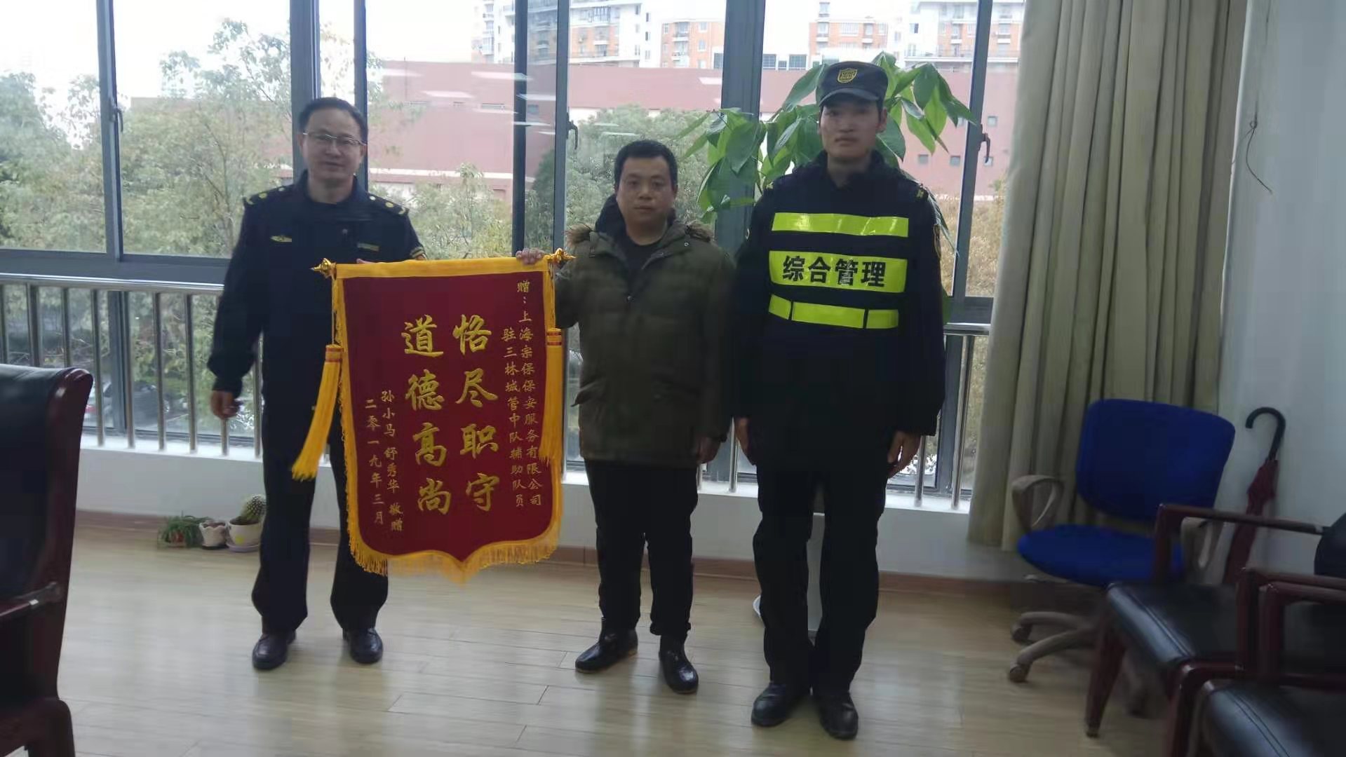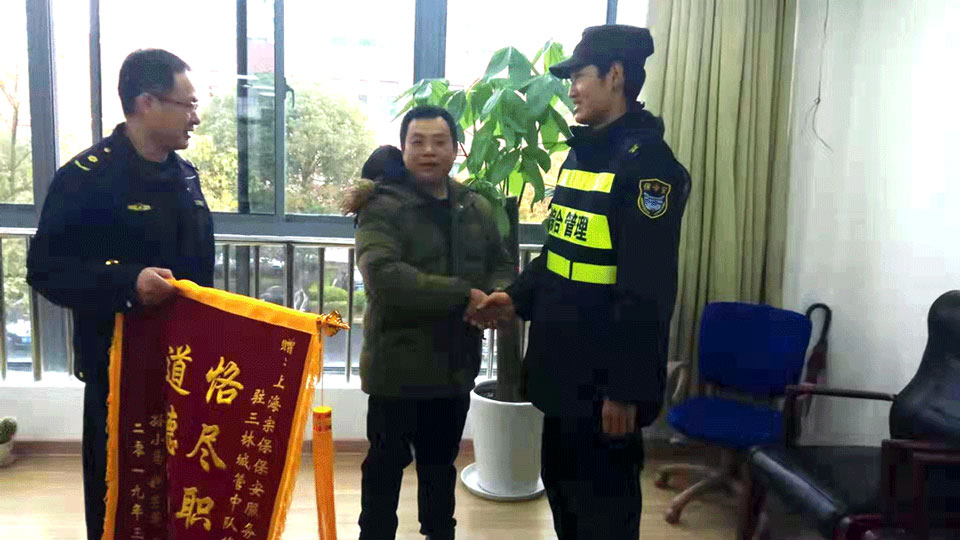 2019年3月18日下午,市民孫先生將一面繡著“恪盡職守,道德高尚”的錦旗送到了三林城管隊,感謝宗保特保隊員幫他找回孩子。