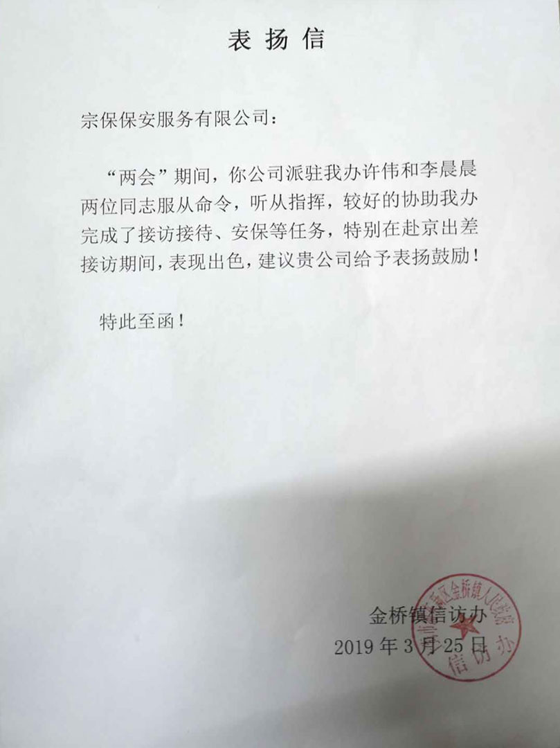 2019年3月25日,宗保駐金橋輔警項(xiàng)目收到一封來自金橋鎮(zhèn)人民政府信訪辦的表揚(yáng)信。