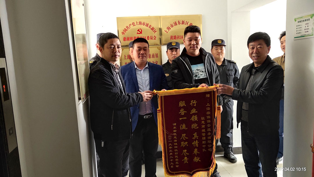 2019年4月2日,上海惠南鎮(zhèn)四墩村朱書記、姚主任將一面繡有“行業(yè)領(lǐng)跑,真情奉獻(xiàn),服務(wù)一流,盡職盡責(zé)”的錦旗送到宗保惠南區(qū)域經(jīng)理王鳳樓、市容隊(duì)長王華奇的手中,對宗保駐惠南輔助隊(duì)伍在“美麗庭院”專項(xiàng)整治過程中的工作,給予了充分的肯定。
