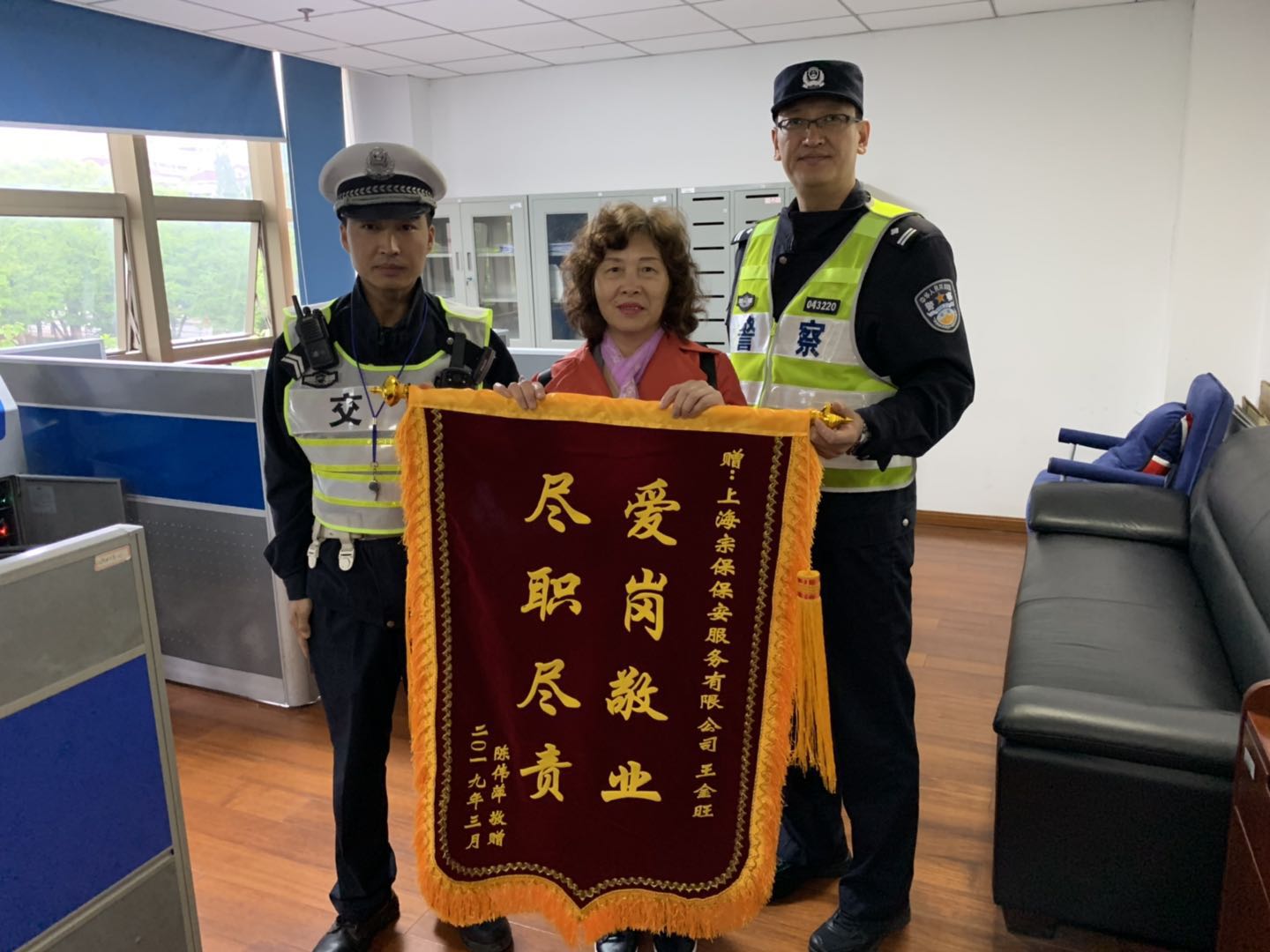 2019年4月26日,陳阿姨將一面繡著“愛崗敬業(yè)、盡職盡責(zé)”8個(gè)字的錦旗送到閔行虹橋龍柏所感謝宗保輔警隊(duì)員王金旺。