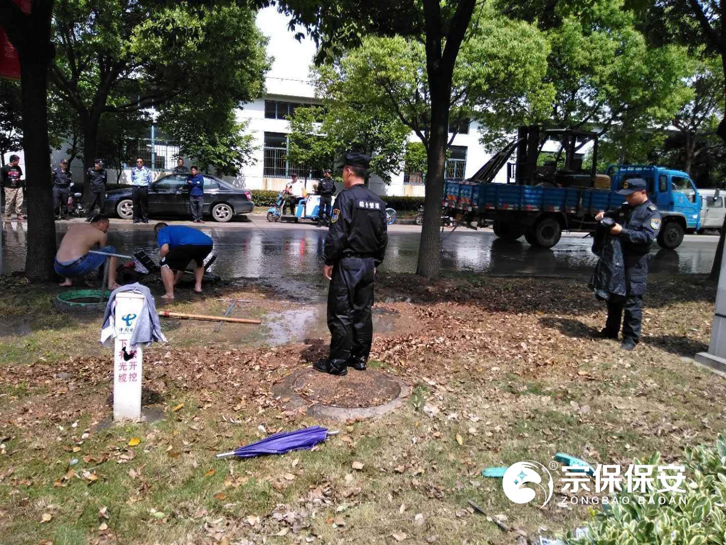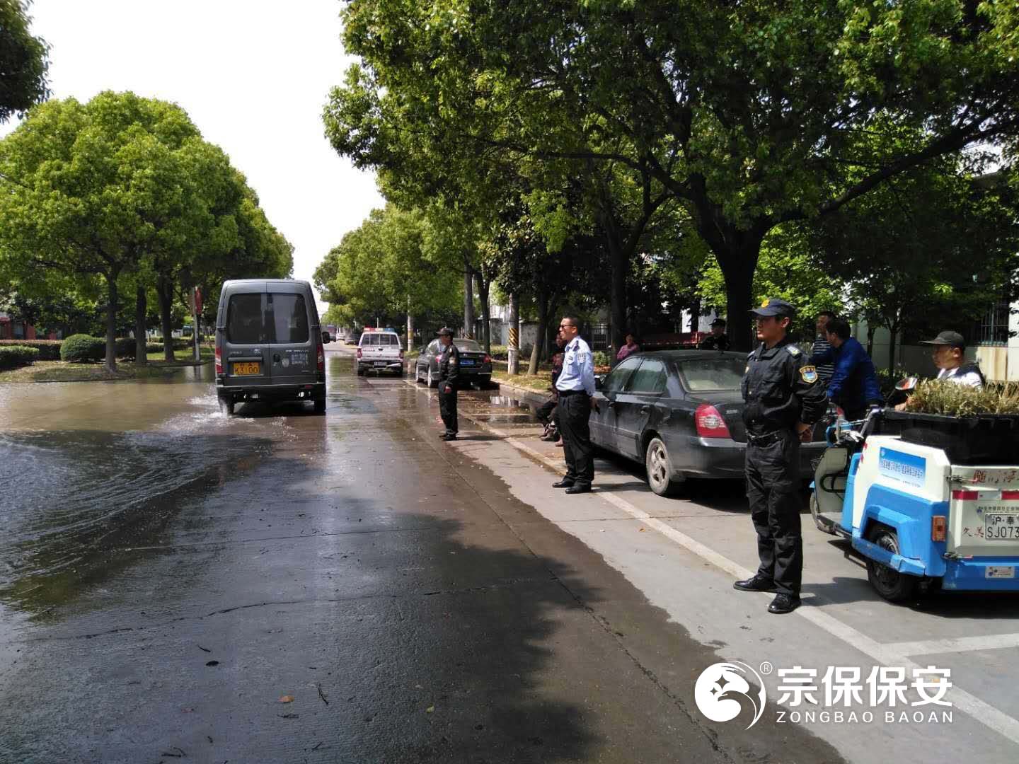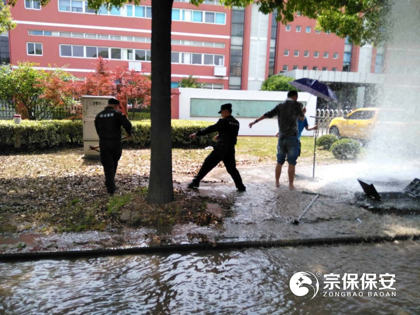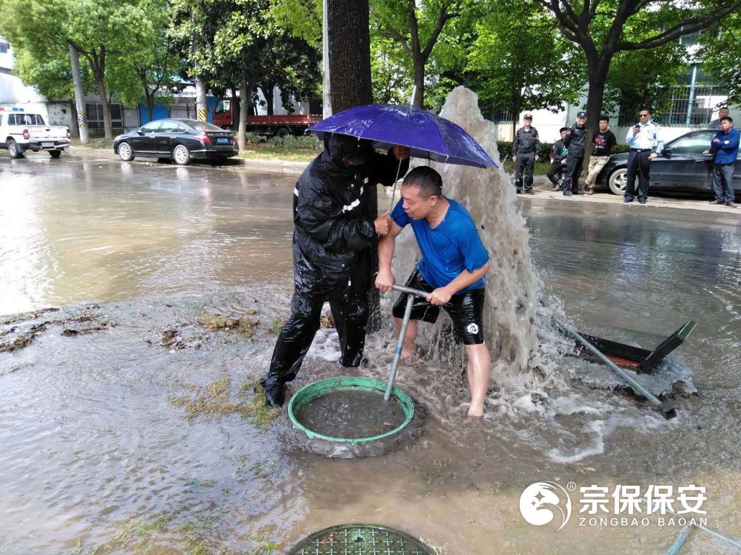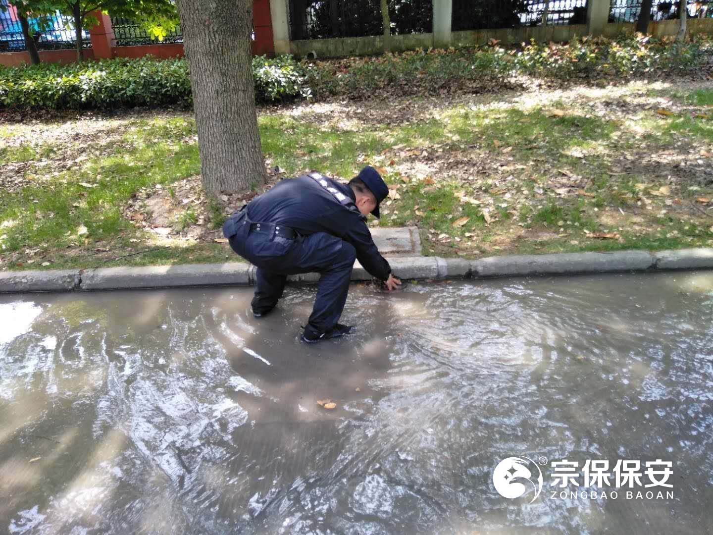 現(xiàn)場由于水管嚴(yán)重破裂,造成路面大量積水,影響過往車輛和行人通行。宗保隊員打開隨騎電瓶車警燈現(xiàn)場指揮交通,并對路邊堵塞雨水篦子進行疏通,及時排掉路面積水。