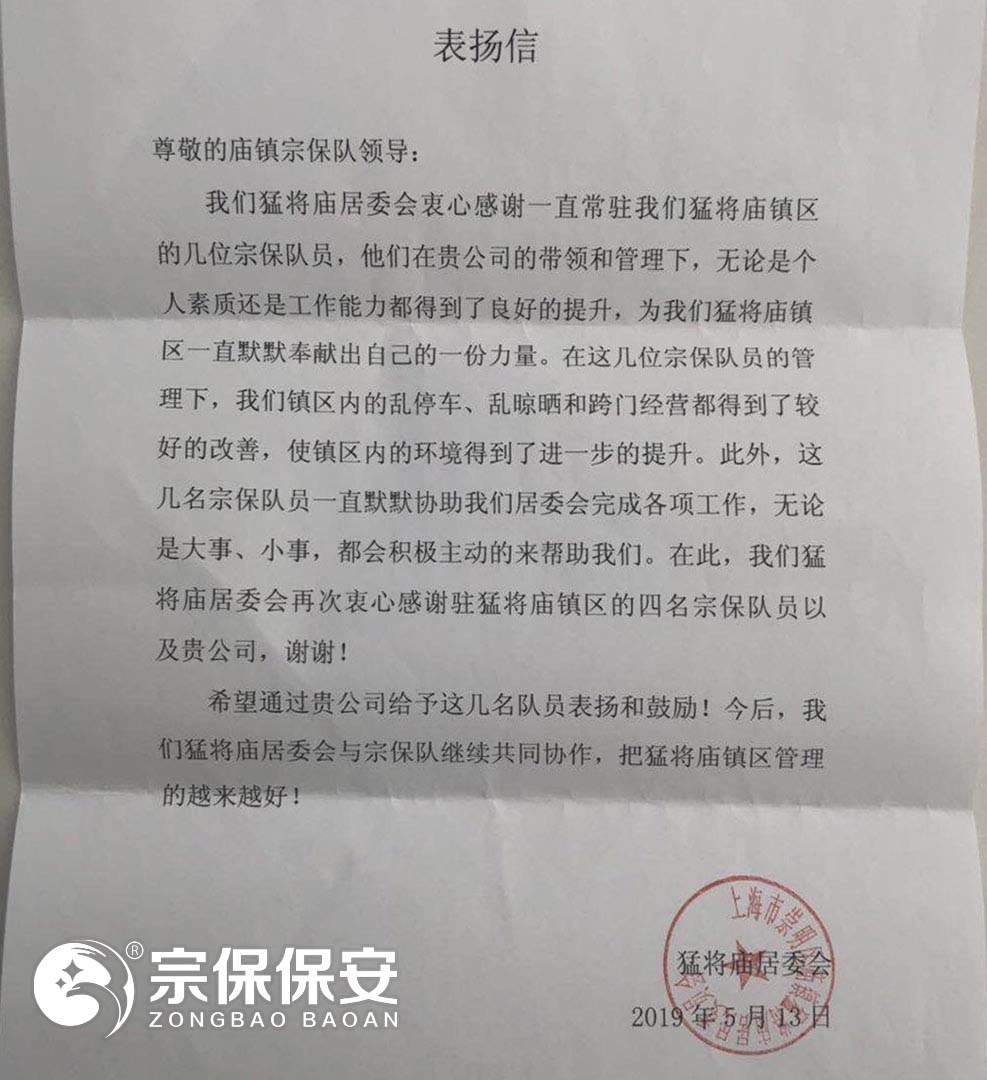 2019年5月20日,崇明廟鎮(zhèn)合作居委會(huì)陳書記將一封表揚(yáng)信送到宗保保安駐崇明廟鎮(zhèn)項(xiàng)目,以表示對宗保公司工作的認(rèn)可及感謝。