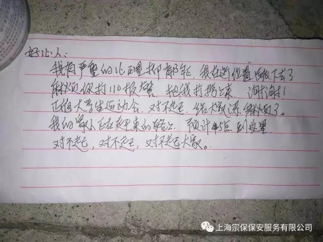 9月13日凌晨5時20分許,天剛蒙蒙亮,宗保下屬浙江民泰保安公司駐余杭公安倉前派出所巡邏隊(duì)員雷亮、劉威震、韓輝,粟建平等人正在轄區(qū)內(nèi)巡邏。在經(jīng)過良睦路口橋面時,他們發(fā)現(xiàn)橋邊有一雙拖鞋和一個罐子,罐子下面壓著一張紙條!上面有一段寫著:·······我在這個位置跳下去了·······麻煩把我撈上來····對不起大家!