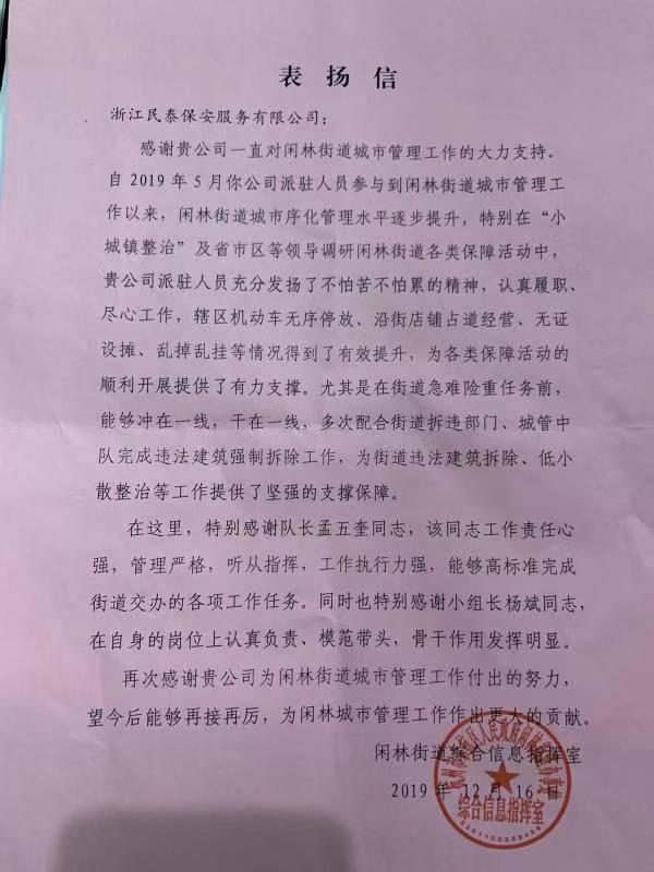 12月16日,浙江民泰公司收到一封來(lái)自閑林街道綜合信息指揮室的表?yè)P(yáng)信,對(duì)公司駐閑林城管項(xiàng)目隊(duì)伍半年來(lái)的工作表示肯定和贊揚(yáng)。