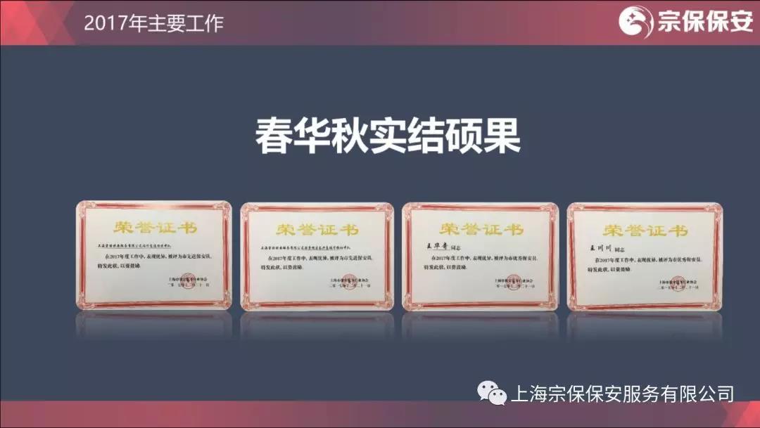 2017年,閔行交通輔警項目、長興島城管輔助項目被評為上海市先進保安隊,高行城管輔助項目被評為浦東新區(qū)先進保安隊,王華奇、王川川被評為上海市優(yōu)秀保安員。榮譽的背后是公司領導精心謀劃、耐心督促、細心檢查,是隊長、骨干親力親為、模范帶頭、一以貫之,是隊員們日日夜夜、風風雨雨、點點滴滴。獎狀和證書,是宗保人青春與汗水的見證。
